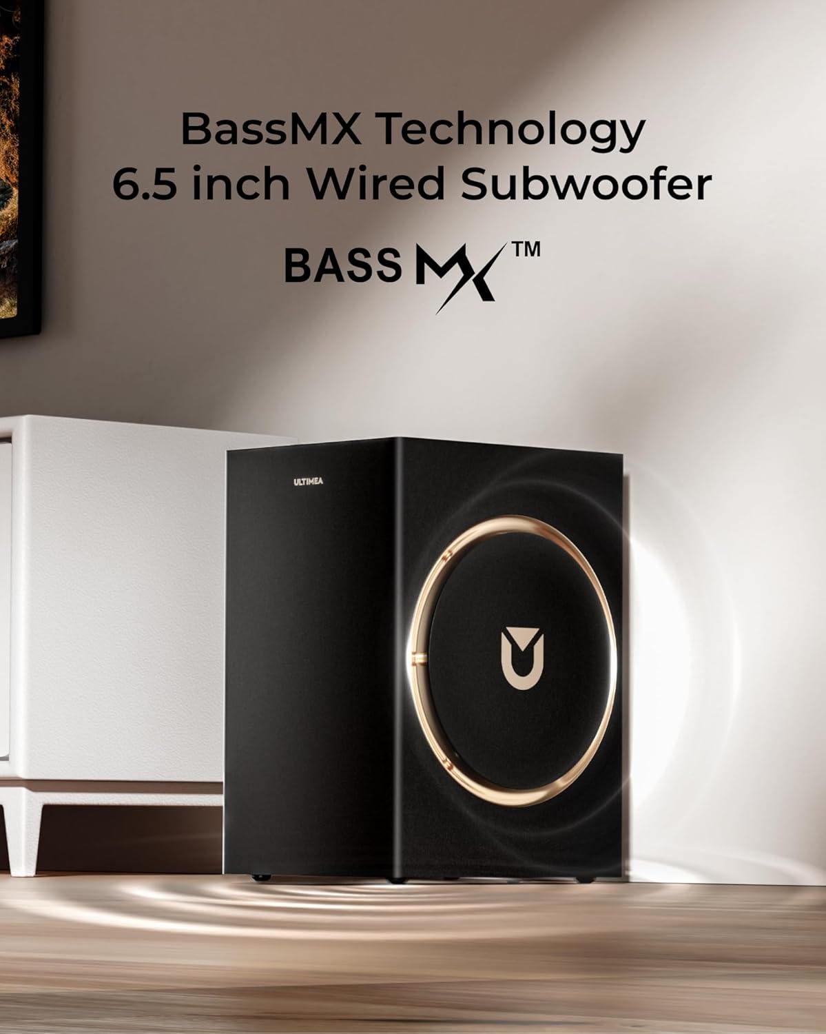 BassMX Technology: The upgraded 6.5-inch subwoofer features a larger 25mm voice coil, 18mm excursion, and an expanded 7.2L wooden cabinet—delivering more powerful and resonant low frequencies. With extended bass response down to 38Hz, it adds deeper punch and better control to action scenes, explosions, and music beats.This larger acoustic chamber produces a broader soundstage and stronger physical impact than traditional compact subwoofers.