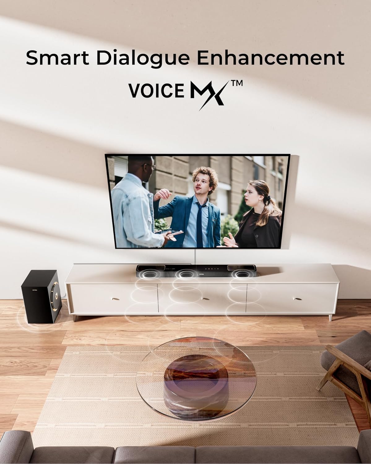 VoiceMX Technology and DSP Processing for Clear Dialogue: VoiceMX enhances vocal clarity in any scene. Real-time DSP processes audio for better channel separation, minimal distortion, and consistent detail at all volumes.