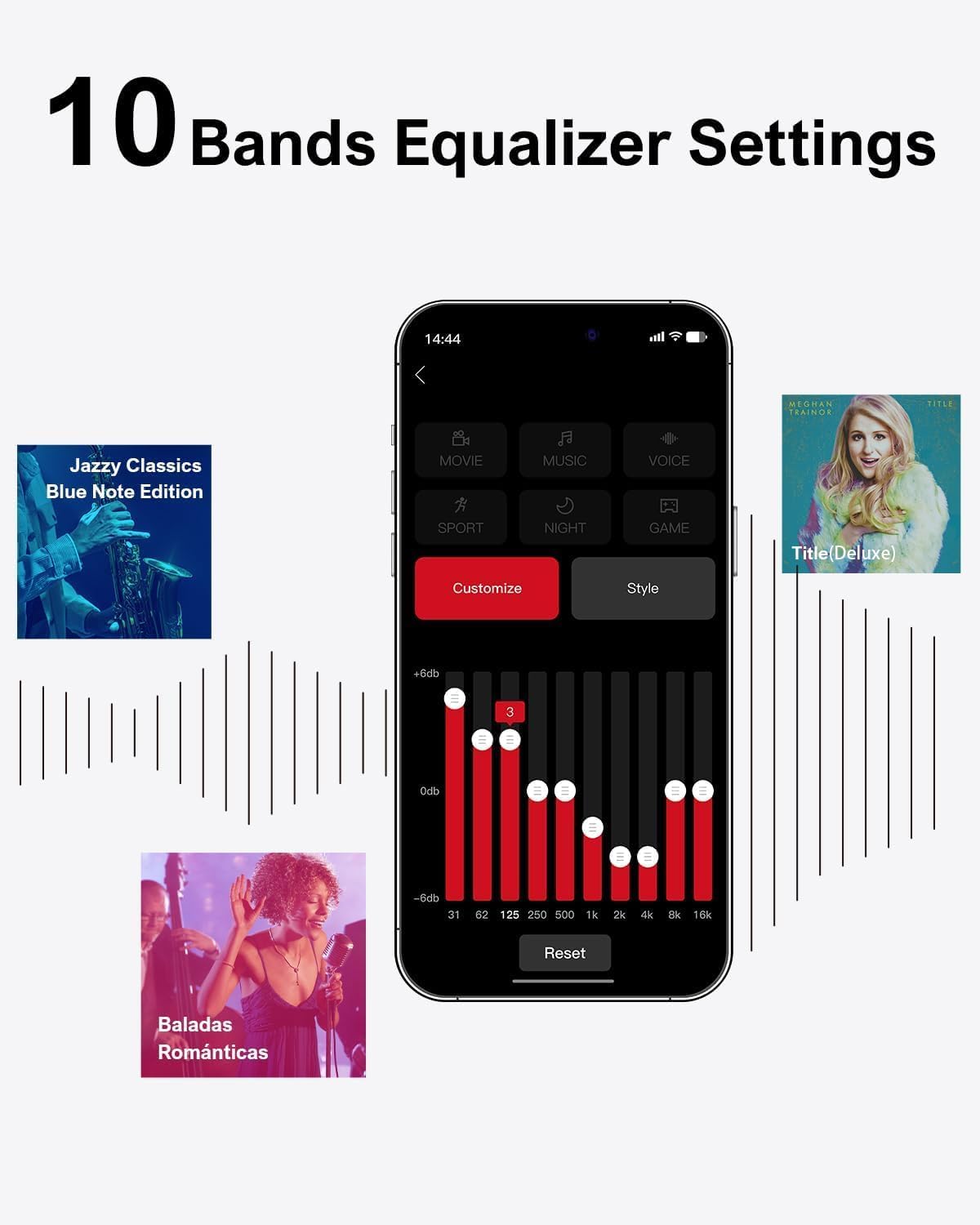 10-Band Equalizer Settings: Choose from 6 dedicated EQ modes — Movie, Music, Voice, Sport, Game, and Night — each calibrated for a specific listening scenario. For even greater control, use the “Customize” feature in the ULTIMEA App to adjust the 10-band equalizer and craft your own perfect sound.