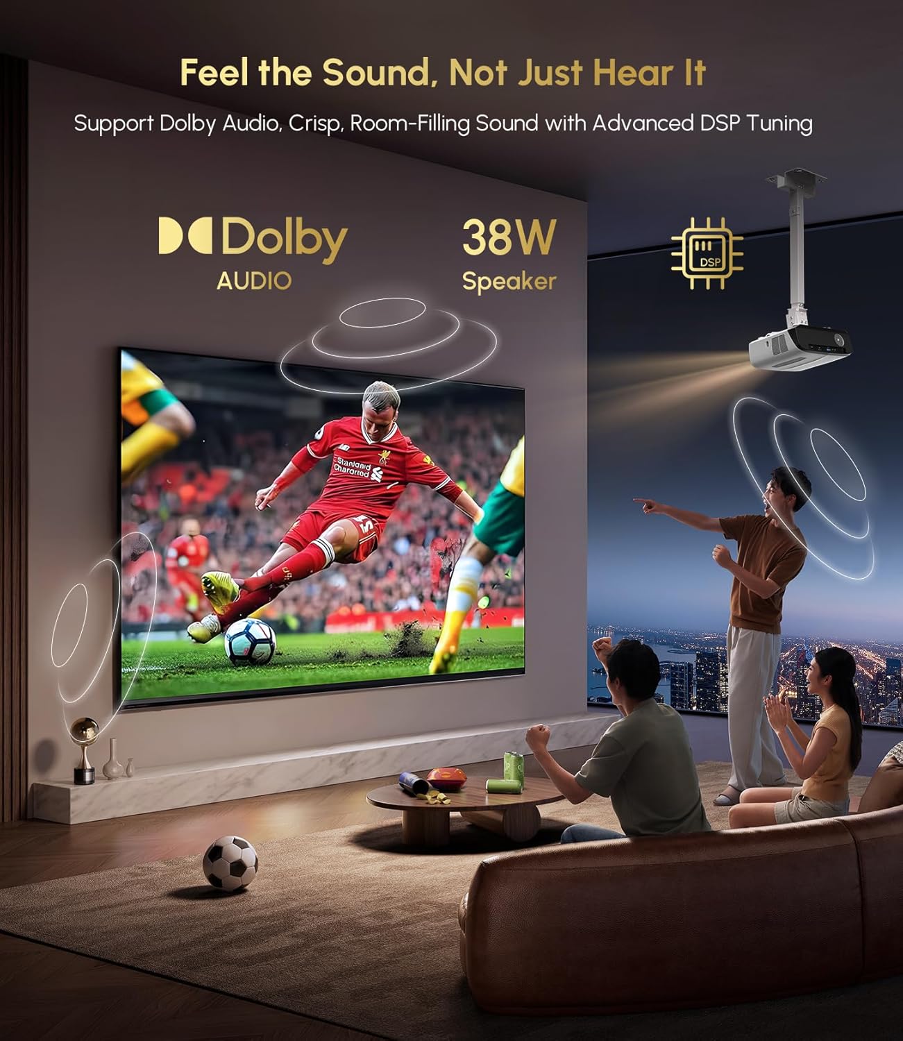 [Dolby Audio & 38W Stereo Speakers ]Immerse yourself in theater-quality sound. 38W DSP high-fidelity speakers with Dolby Audio deliver rich, balanced acoustics with crisp dialogue and deep bass. Skip the soundbar—this home theater projector creates a true cinematic audio experience
