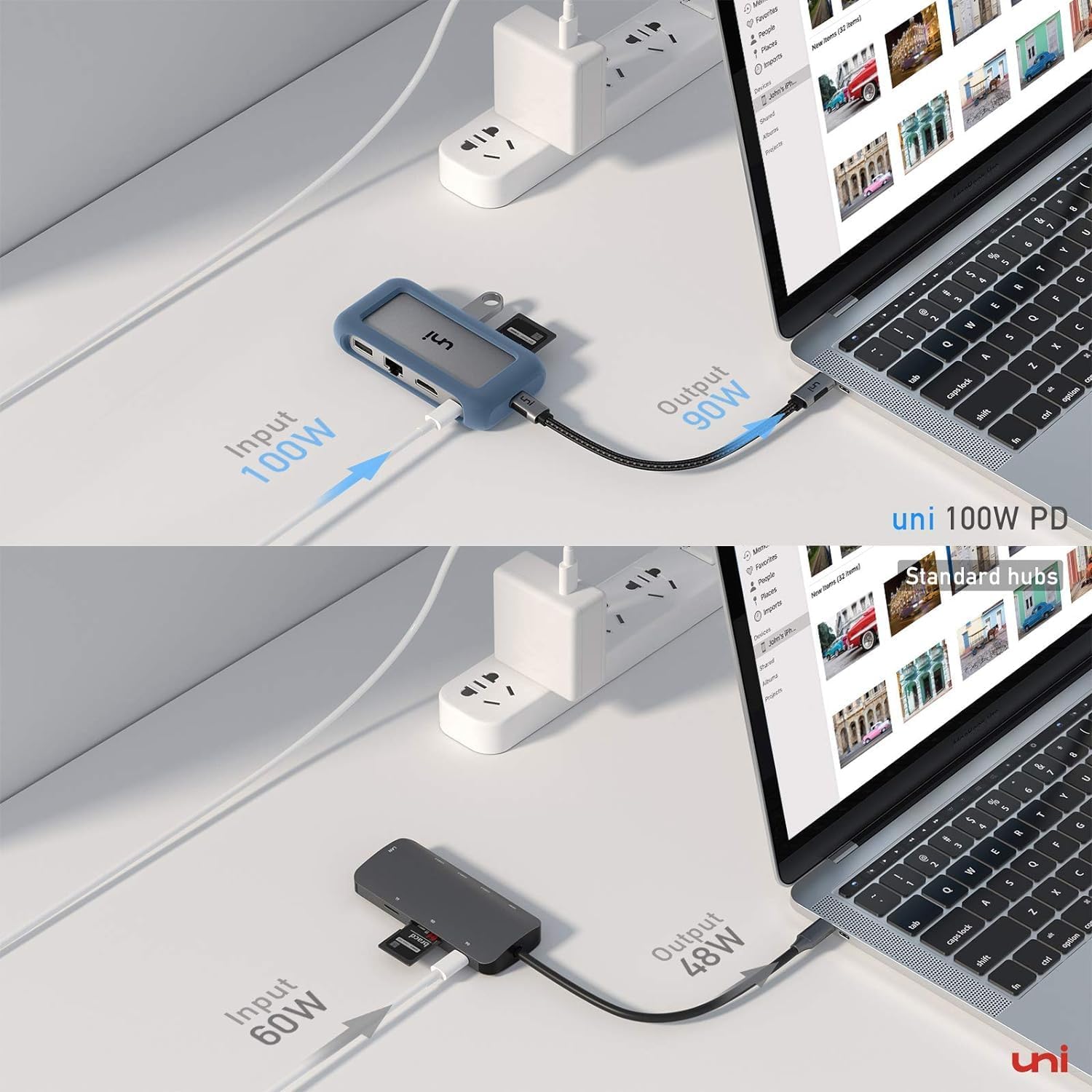 【8-in-1 Multi-Functional USB C Hub】 The uni USB C multiport hub is perfect for Mac series families with Macbook Pro/Air and iPad Pro users. Enjoy 1*4K HDMI, 1*Ethernet port, 100W PD Port, 2*USB 3.0 (5 Gbps), 1*USB 2.0 (480Mbps), and SD/MicroSD Card Reader (up to 104 Mbps). Ideal for home offices, the USB C hub for laptop provides you with more workspace and convenience.