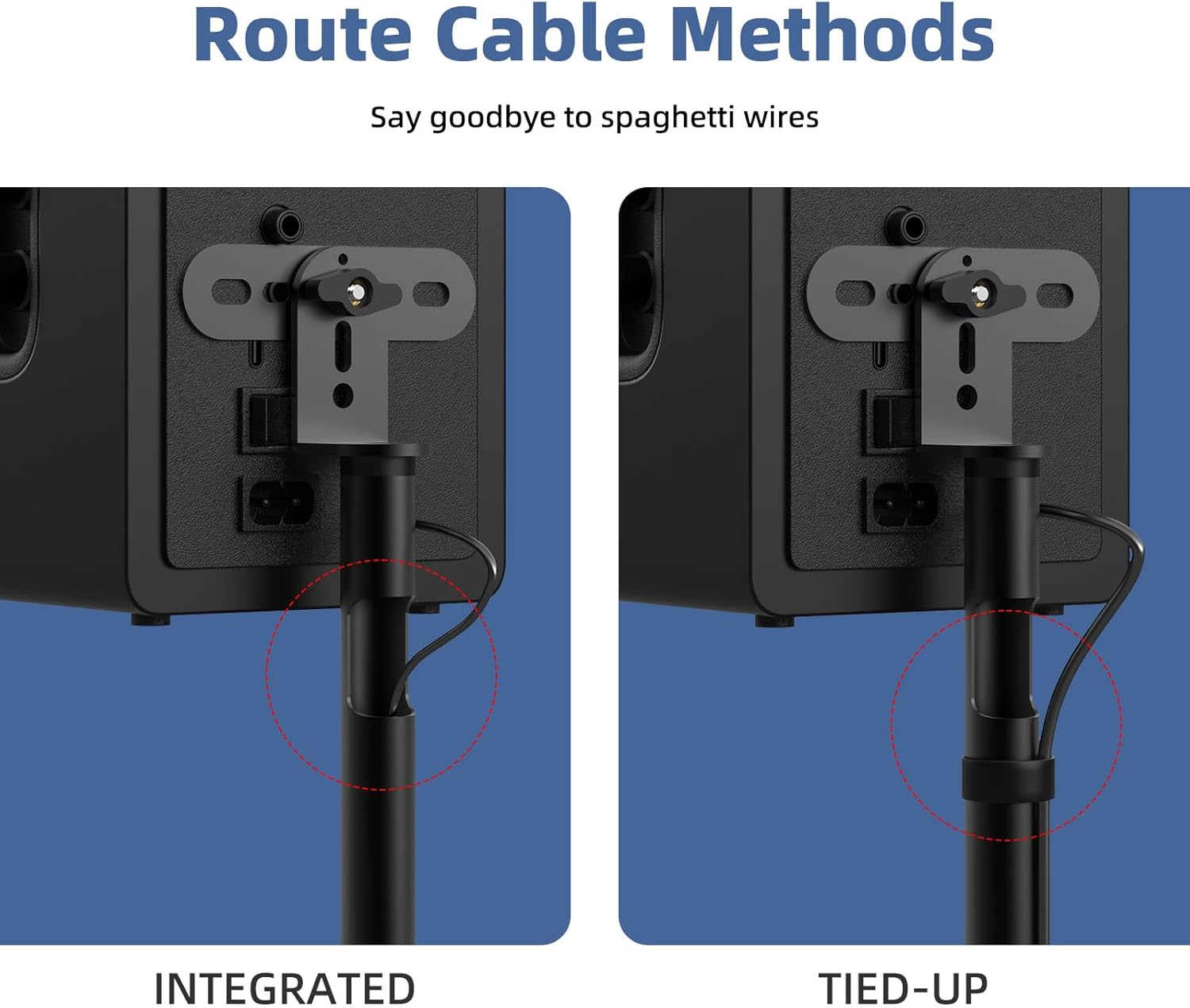 【Cable Wire Management】 Say goodbye to spaghetti wires. The speaker stands for surround sound, keep wires tucked away with larger built-in cable channel. Plus, ten velcro straps make you quickly fix and change the wire.