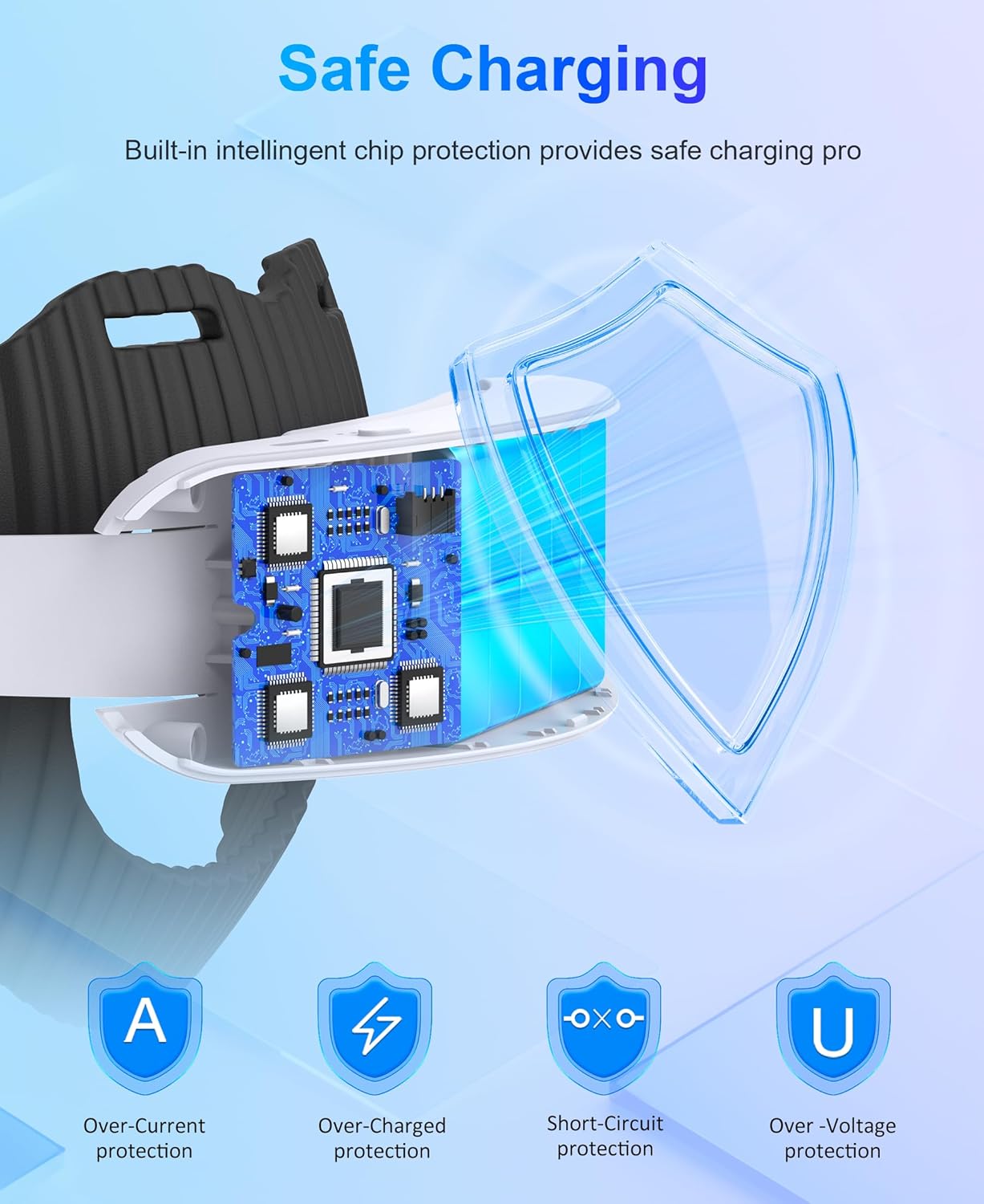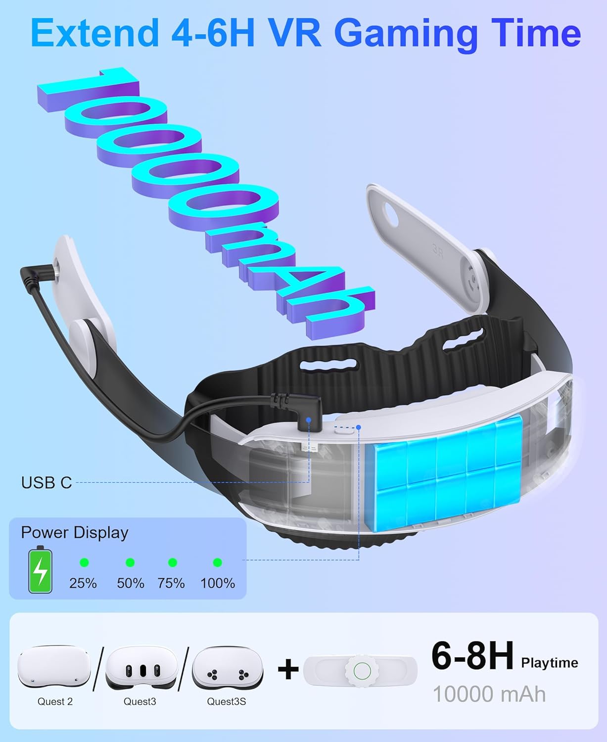 【Meta Quest Elite Strap with Battery & Extend 6H VR Gaming Time】Built in large capacity battery, 10000mAh rechargeable battery pack, can extend 4-6 hours of gaming time. When your VR headset is about to run out of battery, you only need to plug it into the fully charged battery pack to avoid game interruptions. Even in intense games, the headset can still be charged, greatly increasing the convenience of the game