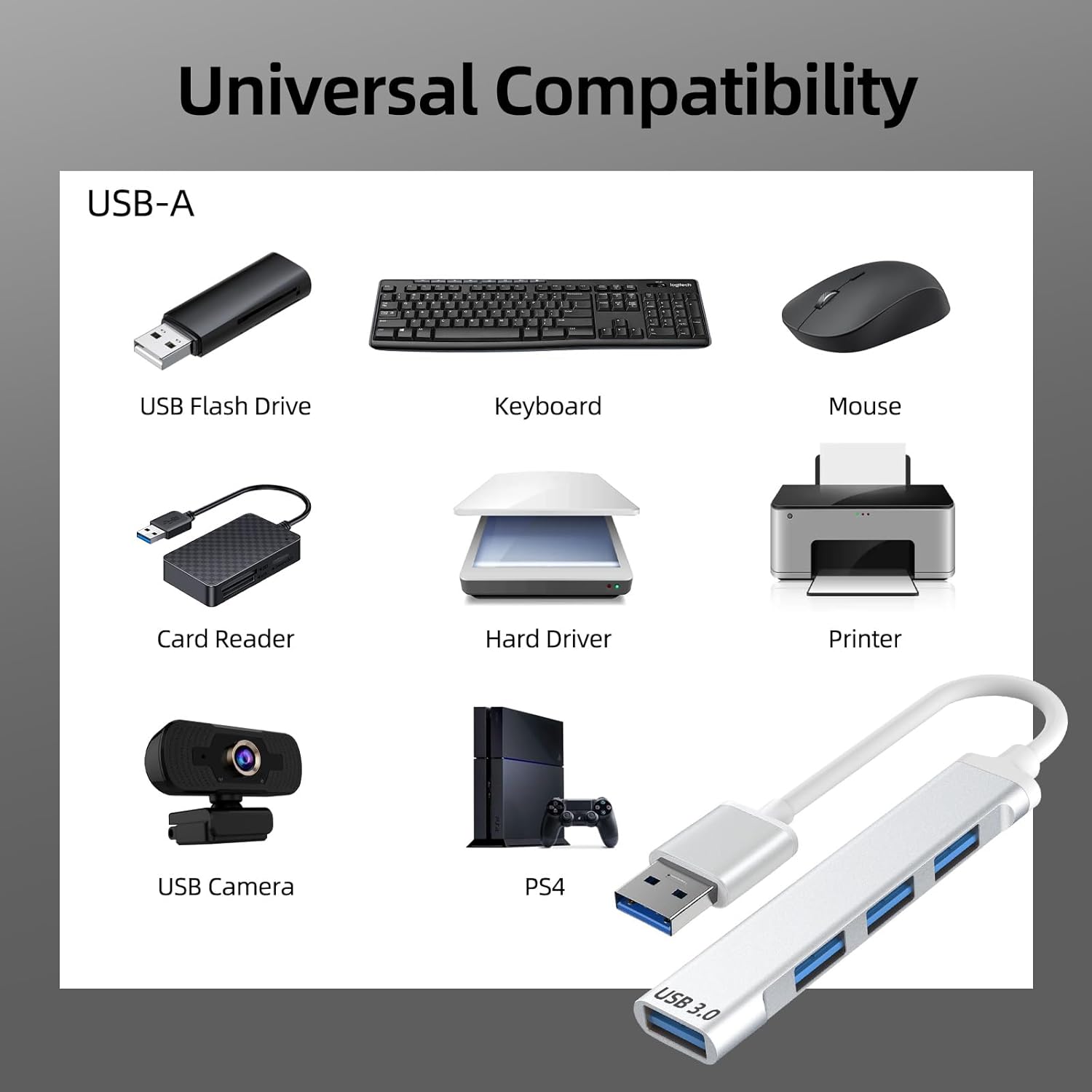 【Wide Appliaction】:4-port USB expander applies to various devices: laptop, pc tower, XBOX, PS4, flash drive, keyboard, mouse, card reader, HDD, cellphone OTG adapter, printer, camera, USB fan and USB cables