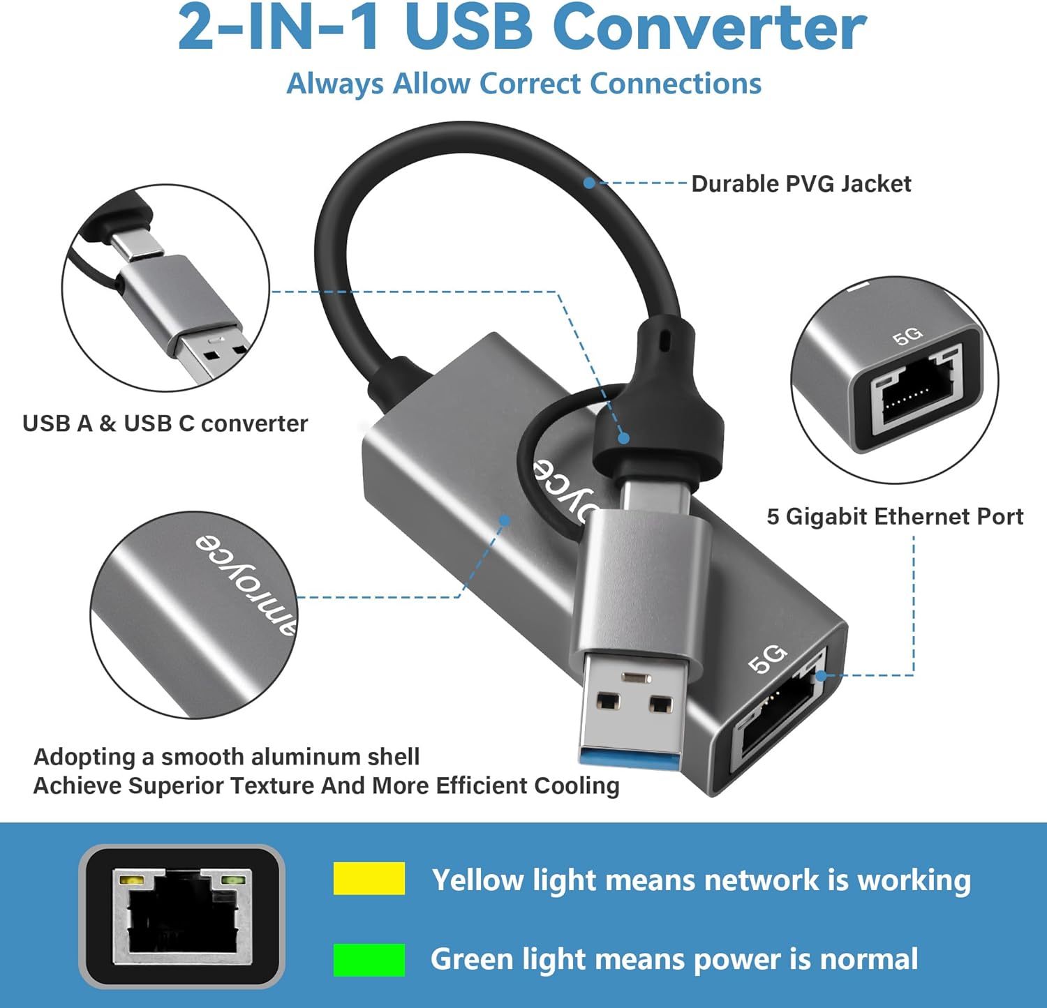 5Gigabit Ultra High Speed: The 2-in-1 USB A/C to Ethernet adapter supports ultra-high speed network speeds of up to 5000Mbps (5Gigabit), which is twice the performance of traditional Gigabit Ethernet adapters and backward compatible with 10/100/1000/2500Mbps. USB powered, no external power required. It is backward compatible with USB 2.0/1.1, ensuring reliable performance on various devices. Make it an ideal choice for file transfer, high-definition video streaming, online gaming, and video conferencing.