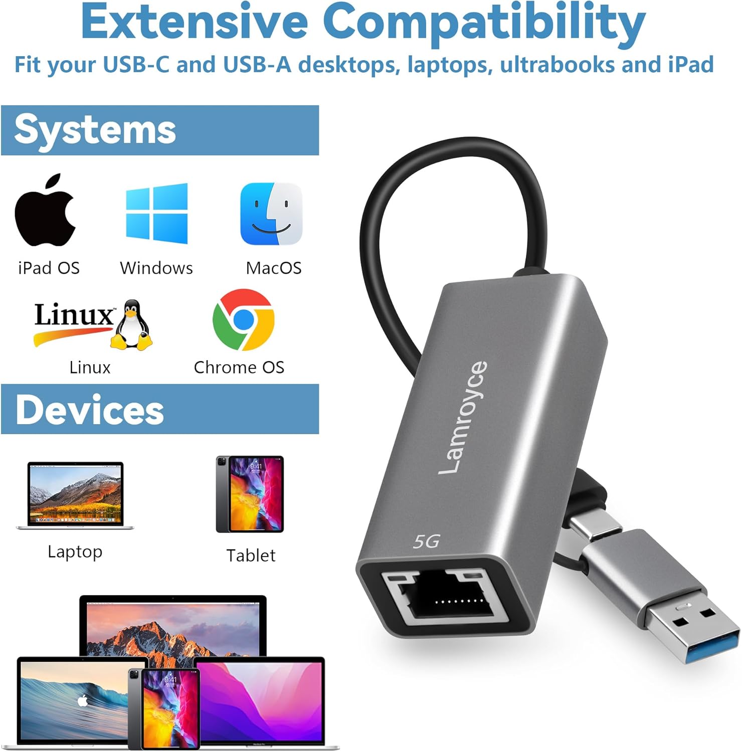 Wide compatibility: Lamroyce USB A/C to Ethernet adapter is compatible with most desktop computers, laptops, Nintendo Switch, Switch Oled, and TV boxes with USB A ports, such as ThinkPad、Surface、XPS、Chromebook、Spectre、ZenBook、MacBook、Mac Mini、Mi Box wait.