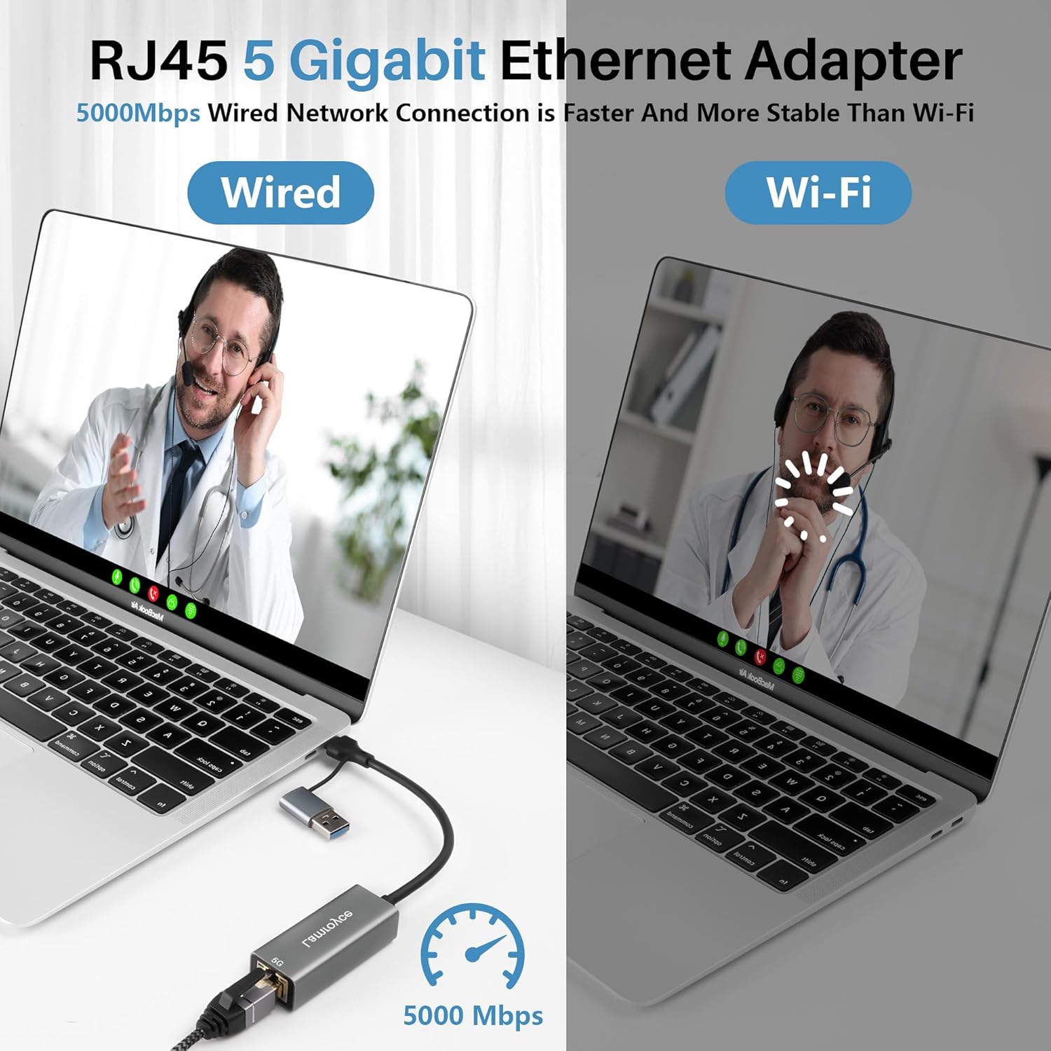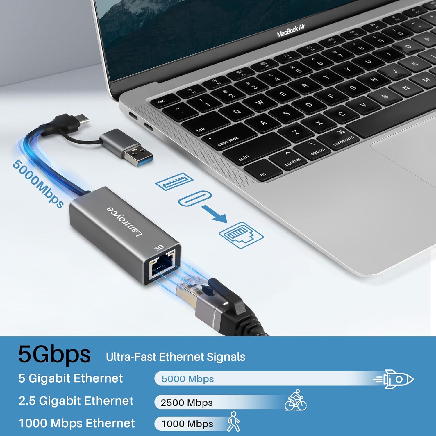 USB 3.0 to Ethernet Adapter 5G, USB C 3.1 to RJ45 5Gigabit LAN (5000Mbps) Network Internet Adapter Converter, Support 2.5G/1000/100/10Mbps, Plug and Play,for Laptop, MacBook, Windows, MacOS,Linux