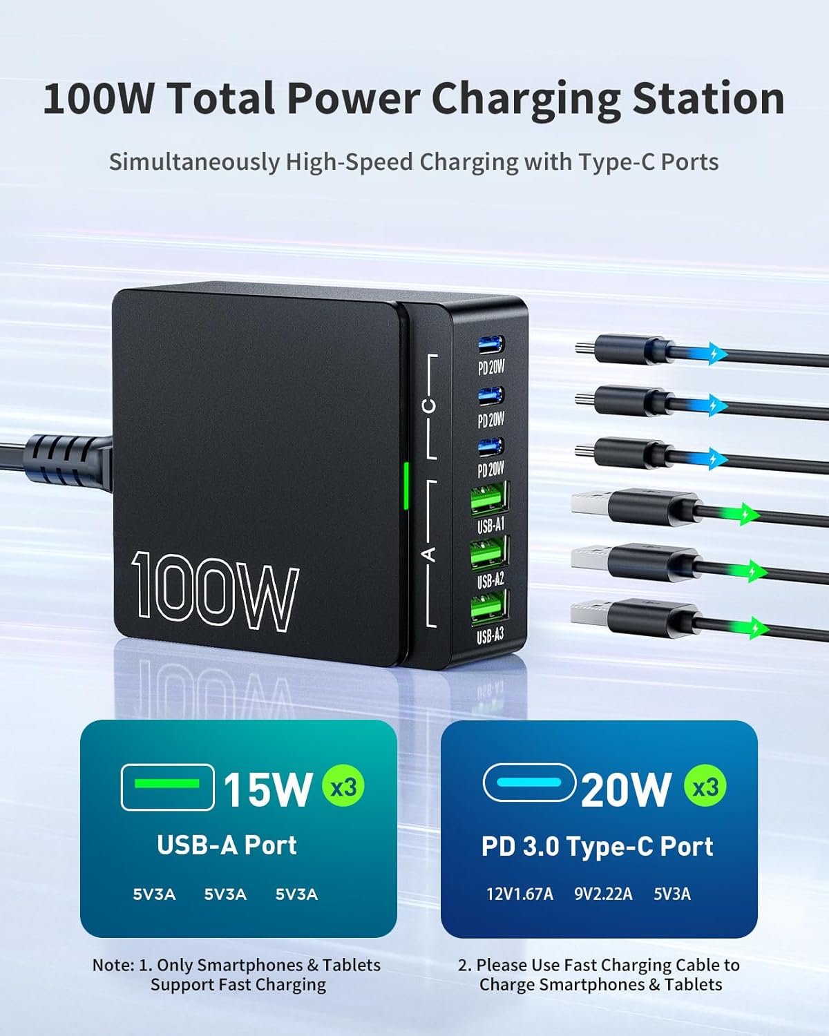【Fast Charging】This product features 3 Type-C ports and 3 USB-A ports, with a total power of 100W. Only the Type-C ports support fast charging (max 20W per port), while USB-A ports do not (max 15W per port). Fast charging is limited to smartphones and tablets; older models may not be compatible, so check your device’s specifications first. A certified fast-charging cable is also required for fast charging with compatible devices.