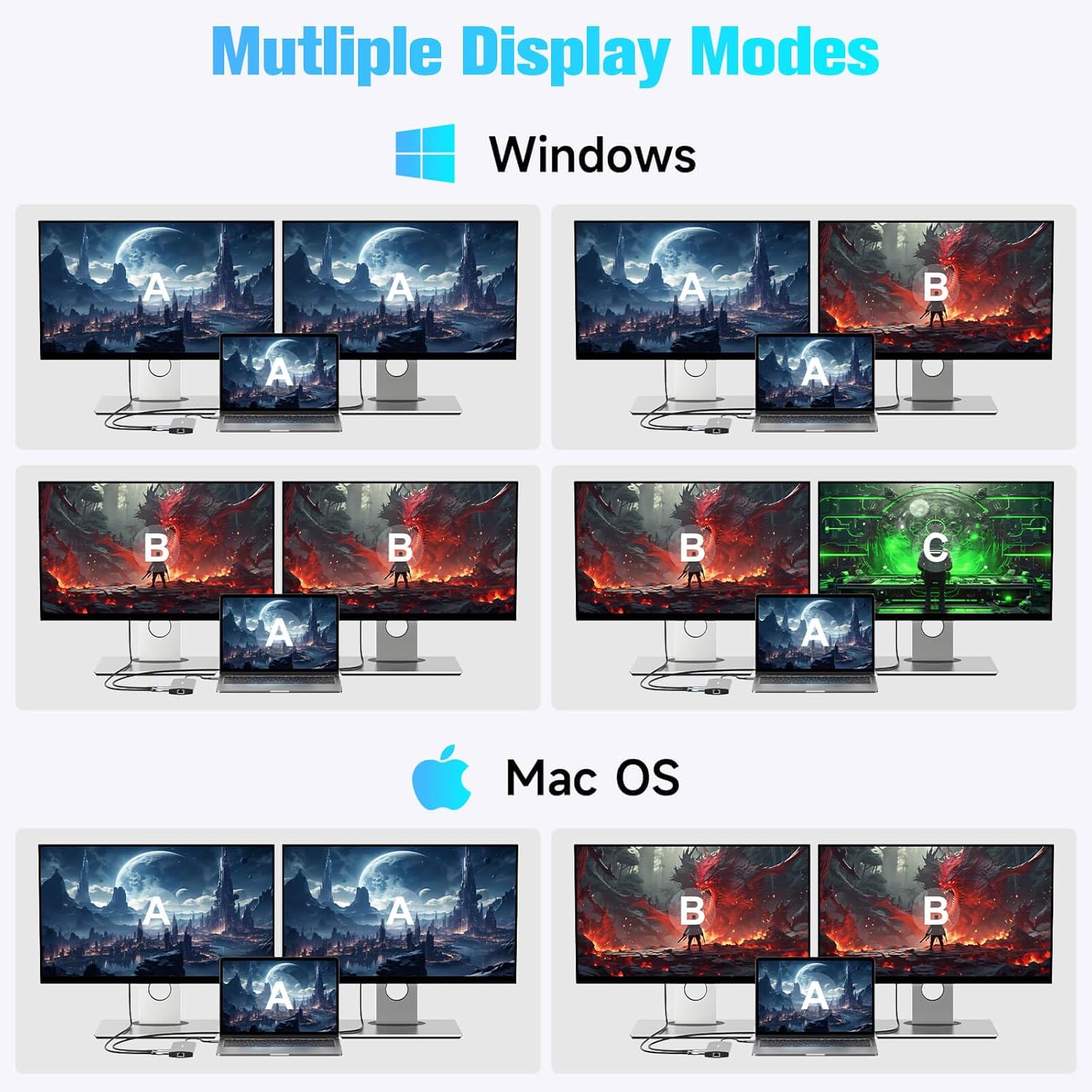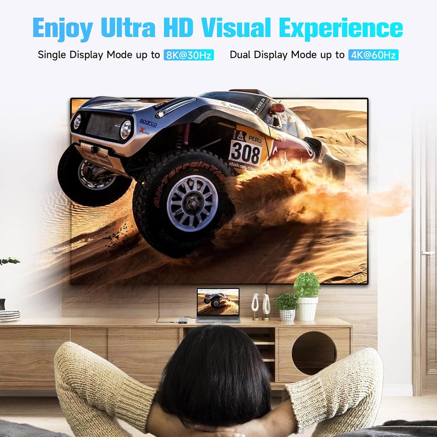 Docking Station Dual Monitor: The USB-C hub expands your workspace with dual HDMI outputs (4K@60Hz and 8K@30Hz). Seamlessly mirror or extend displays on ultra-high-definition monitors or TVs for presentations, multitasking, or immersive entertainment