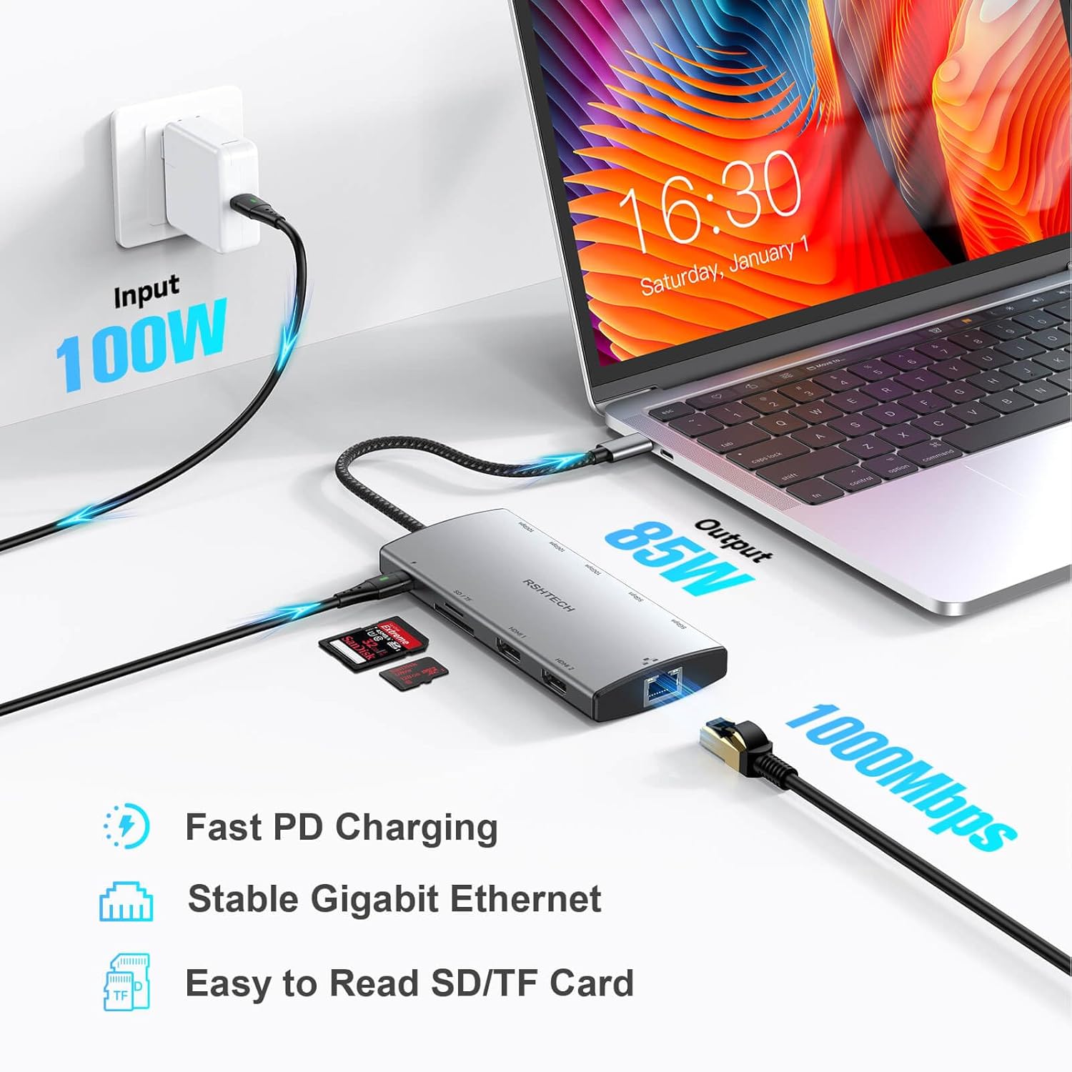 100W Power Delivery: Keep your laptop powered strong! 85W USB-C Power Delivery pass-through charging (100W input, 15W hub usage) allows you to plug in your charger to power the laptop while using all USB hub functions