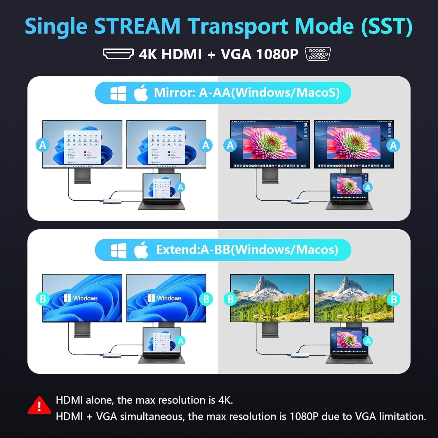 4K HDMI and 1080P VGA – The Aplimln usbc hub with HDMI and VGA supports high-definition displays, projectors, and more. The resolution is up to 3840×2160@30Hz (4K) when using HDMI alone, and is backward compatible with 1920×1080@60Hz (1080P), 1280×1024, 1600×1200, 720p, and more. When using HDMI and VGA at the same time, the resolution is limited by VGA up to 1080p. (Note: When using VGA and HDMI at the same time, one display will default to Mirror Mode and the other will default to Extended Mode.)