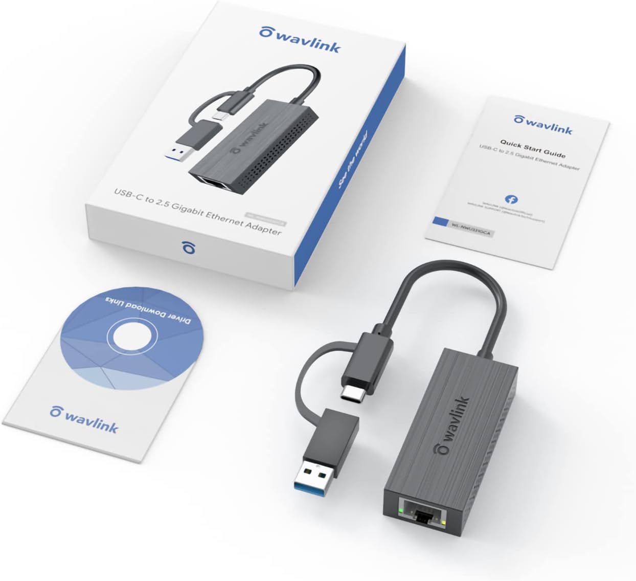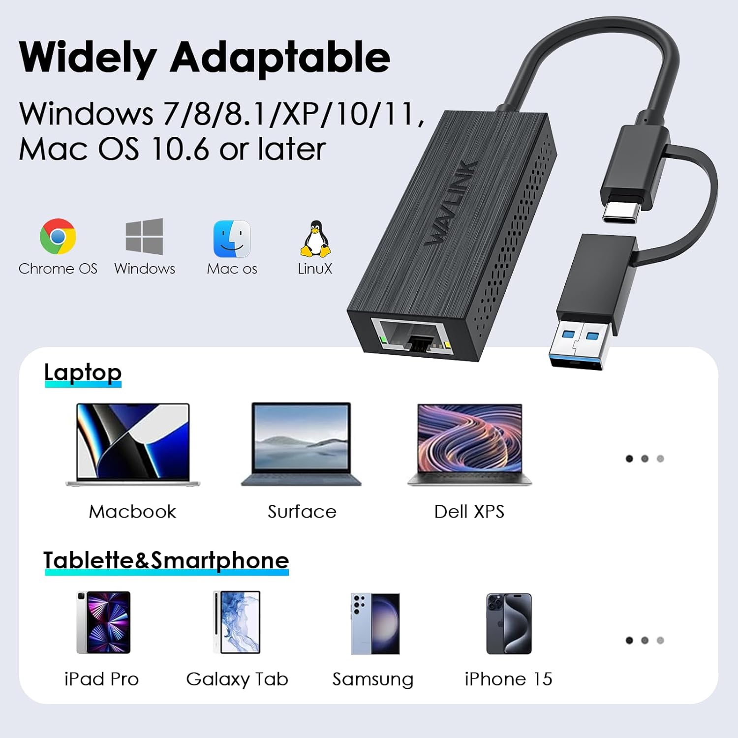 USB C to Ethernet Adapter, WAVLINK 2.5G USB LAN Adapter, Compatible with Laptop, PC with Windows 7/8/10, XP, Vista, Mac OS 10.6 or Later