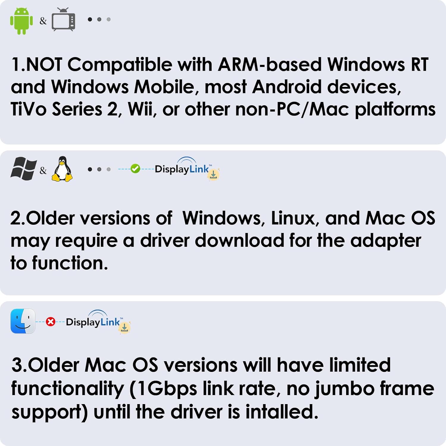 Note – NOT Compatible with ARM-based Windows RT and Windows Mobile, most Android devices, TiVo Series 2, Wii, or other non-PC/Mac platforms. Older versions of Windows, Linux, and Mac OS may require a driver download for the adapter to function. Older Mac OS versions will have limited functionality (1Gbps link rate, no jumbo frame support) until the driver is intalled. Please refer to the manual for the driver.