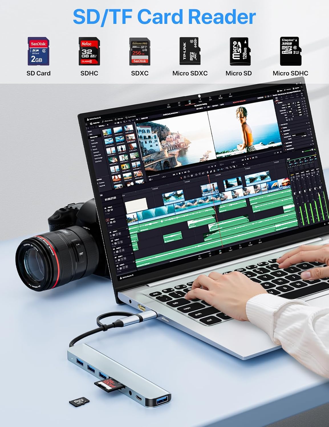 【SD / TF card reader】: WIRWTRU usb c hub multiport adapter is compatible with SD and Micro SD cards with capacities up to 2TB and data transfer rates up to 104MB/s which is good news for travel and photography enthusiasts.