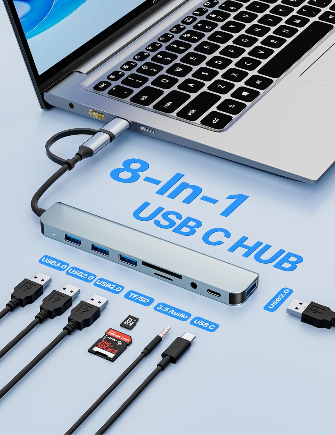 USB C/USB Hub Multiport Adapter,USB 3.0 Hub Aluminum 8 in 1 USB Splitter with SD/TF Card Reader,1 x USB 3.0, 3 x USB 2.0, 1 x USB C,and 3.5mm Audio Output for MacBook Pro Air,iPad Pro,Laptop