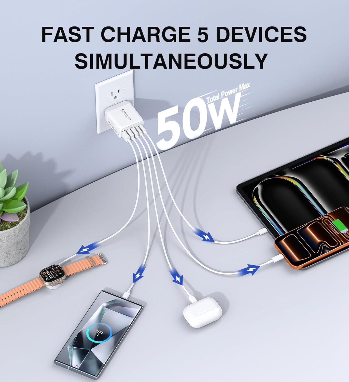 2-Pack 50W Fast Charging Block: 5-Port PD Fast USB C Charging Block featuring 2 USB-C ports and 3 USB-A ports for efficient charging. This usb charging block offers Power Delivery and Quick Charge 3.0 technology, delivering a total power output of up to 50W. The USB-A port provides 3.1A/5V output, while the USB-C port offers a rapid 20W charging speed. It can charge your iPhone 16/15 devices from 0% to 50% in just 30 minutes. Ideal for charging iPhone, iPad, MacBook, Samsung, tablets