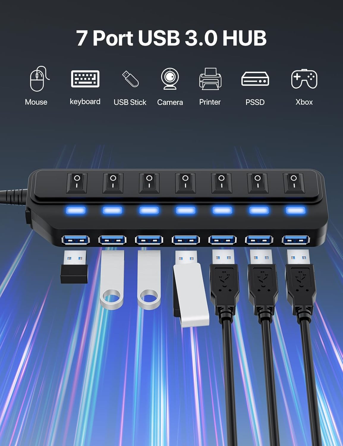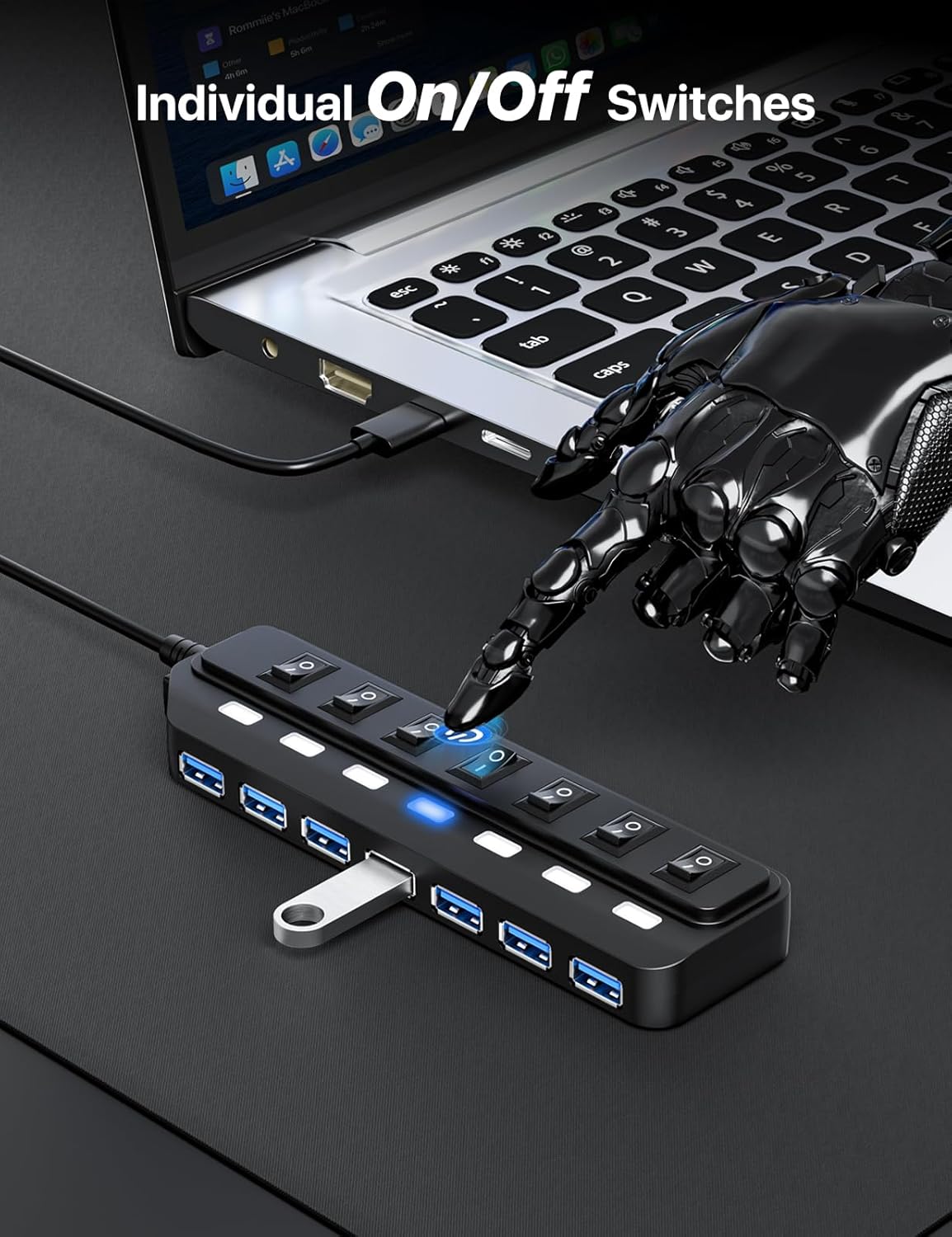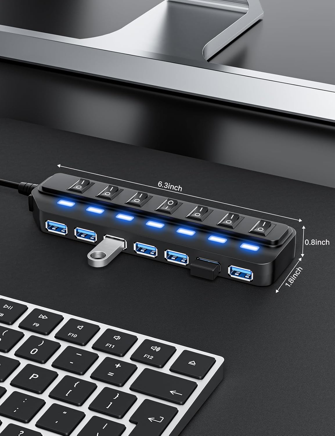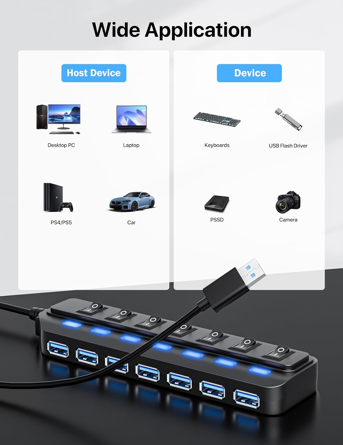 [INDIVIDUAL ON/OFF SWITCHES] WIRWTRU USB hub has built-in on and off switches with led indicators for each port, being able to turn on or off the separate USB port without unplugging the equipment, blue LED lights let you know the working status easily.