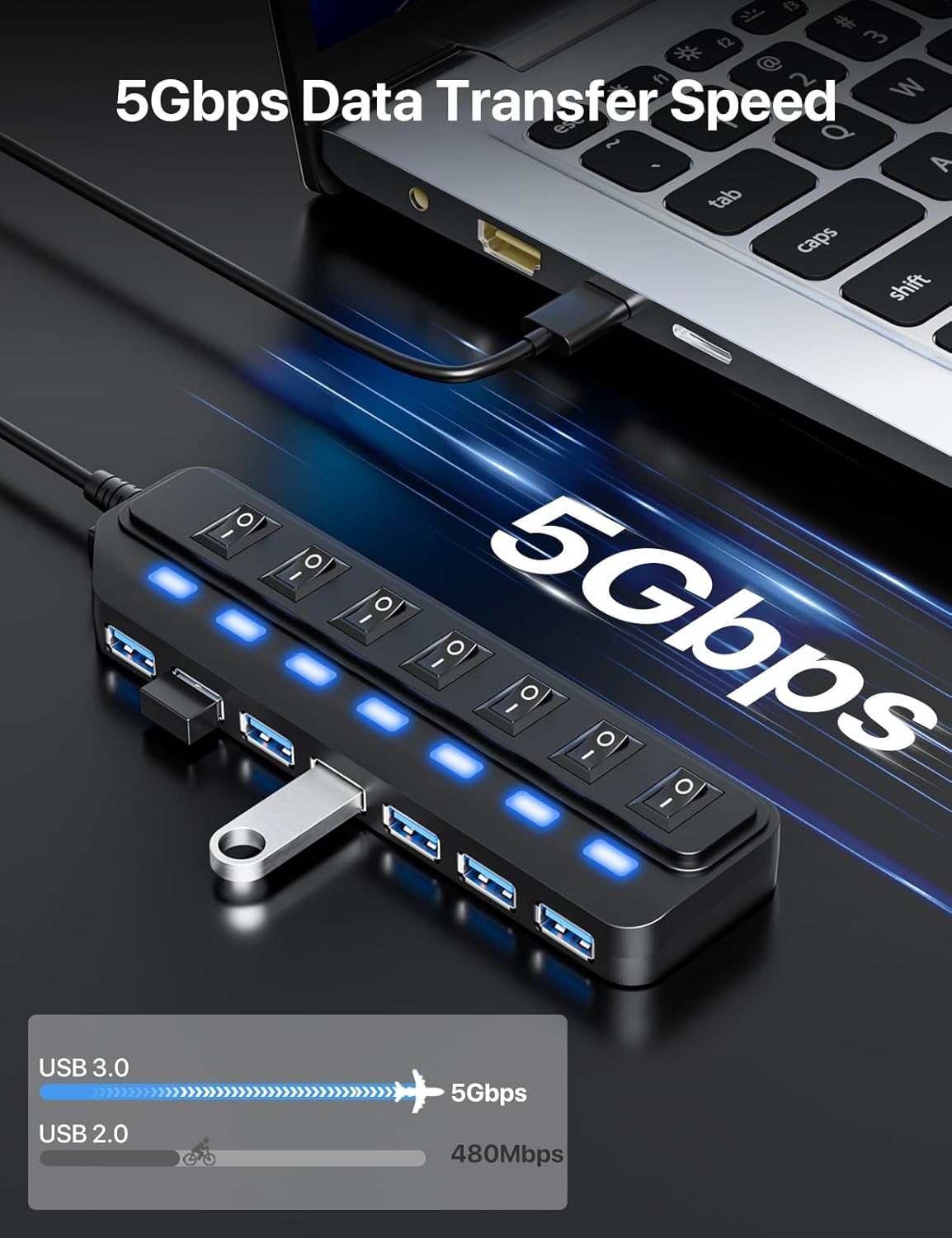 [5GBPS DATA TRANSFER SPEED] The USB 3.0 Hub extension provides up to 5 Gbps data transfer speed, which is more than 10 times faster than USB 2.0, and it is backwards compatible with USB 2.0/1.0