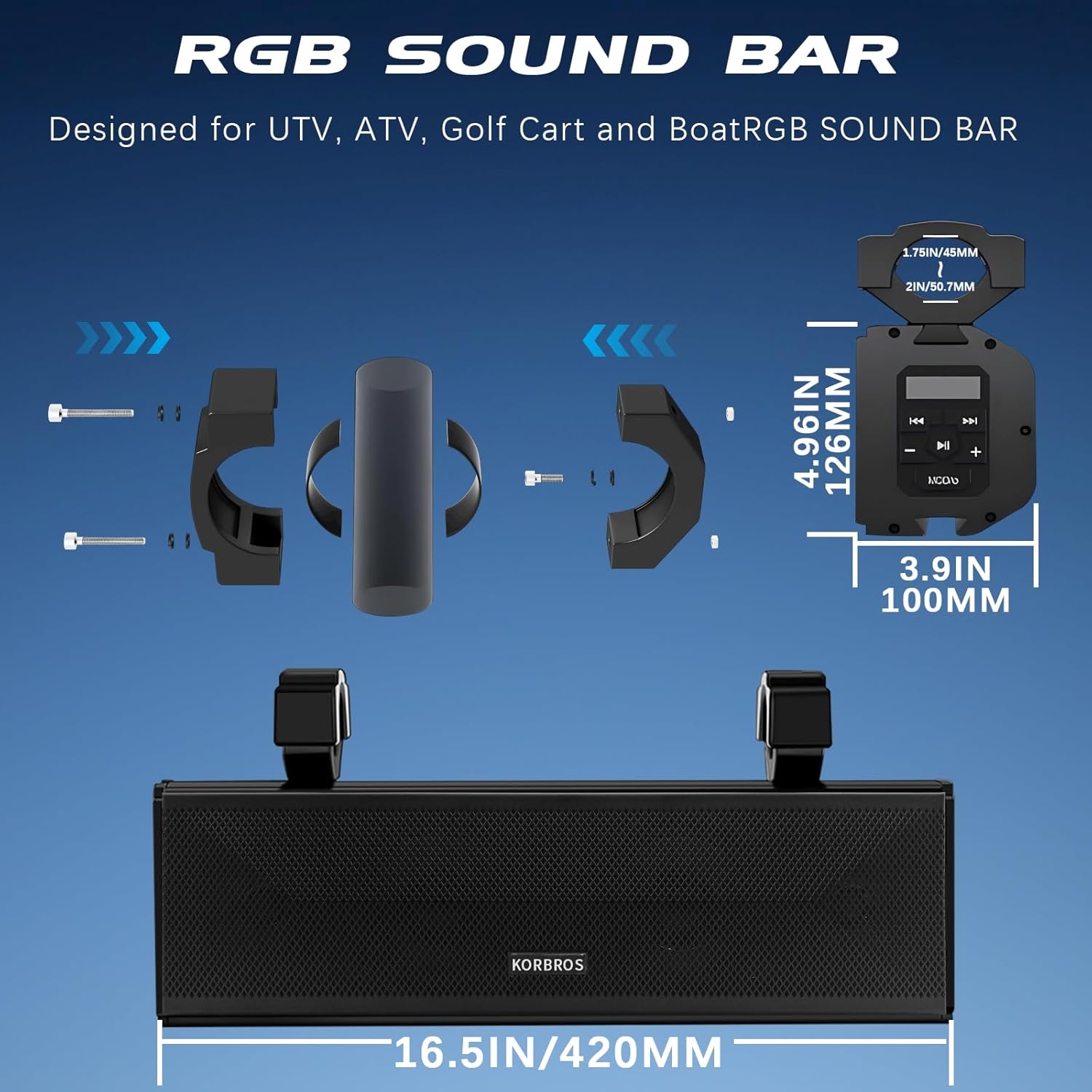 4 Speaker Powersports sound bar – KORBROS UTV speakers with two 4” Full-range Speakers and two 1” Soft Dome Tweeters are powered by a high-performance built-In Class A/B Amplifier with optimized bass performance