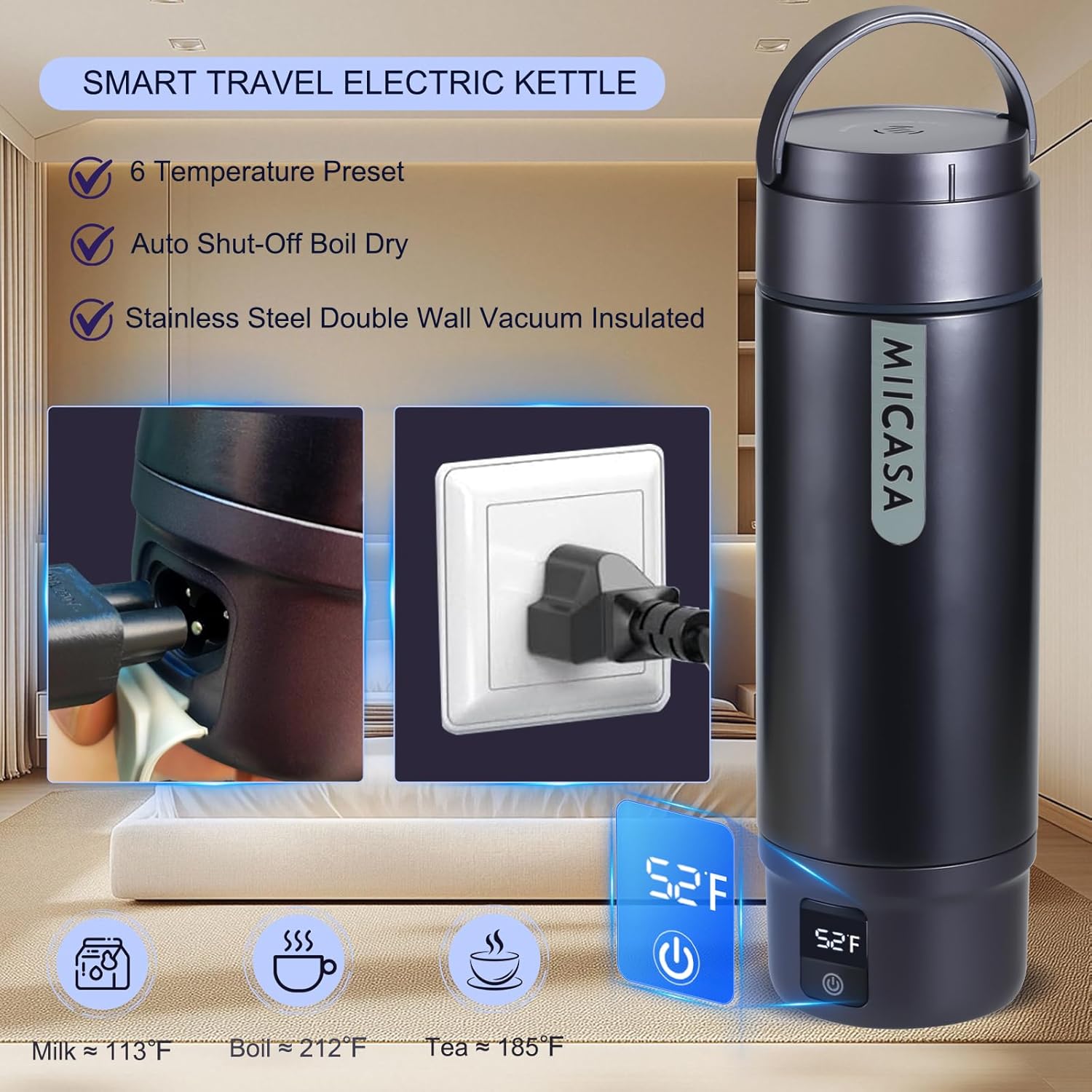 DOUBLE WALL LUXE VACUUM-INSULATED STAINLESS STEEL KETTLE TO KEEP WARM AND COLD: Travel tea kettle is made with a thick, food-grade 304 stainless steel pot, the 304 stainless steel outer shell prevents burns. The lid is made of stainless steel and PP material, non-toxic and odorless. Mini electric kettle provides you with healthy water. Enjoy safe and healthy drinking water wherever you go