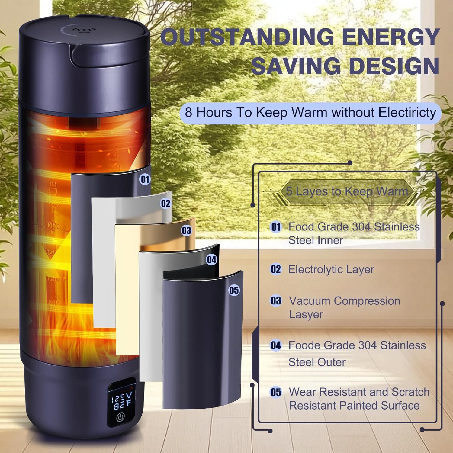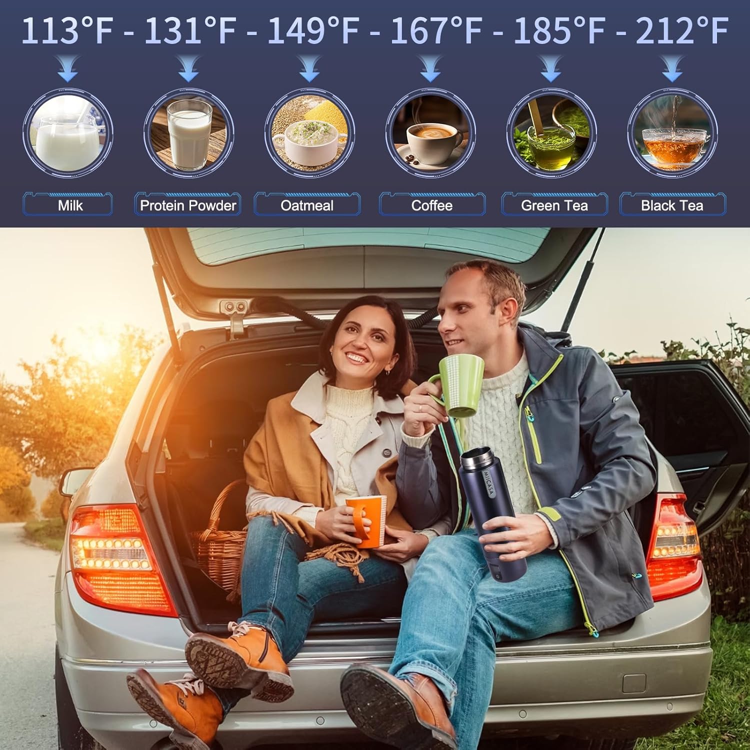 UPGRADE 6-SMART TEMPERATURE PRESET: You can quickly choose car kettle temperature from 113~131~149~167~185 to 212℉; Boil ≈ 212℉, Tea≈185℉, Milk≈113℉, The LCD display will indicate the Real Temp. When the set temperature has been reached you will hear Buzzer sound and portable electric kettle will enter to 113℉ keep warm. Car Kettle can keep warm 12Hr without keeping power on
