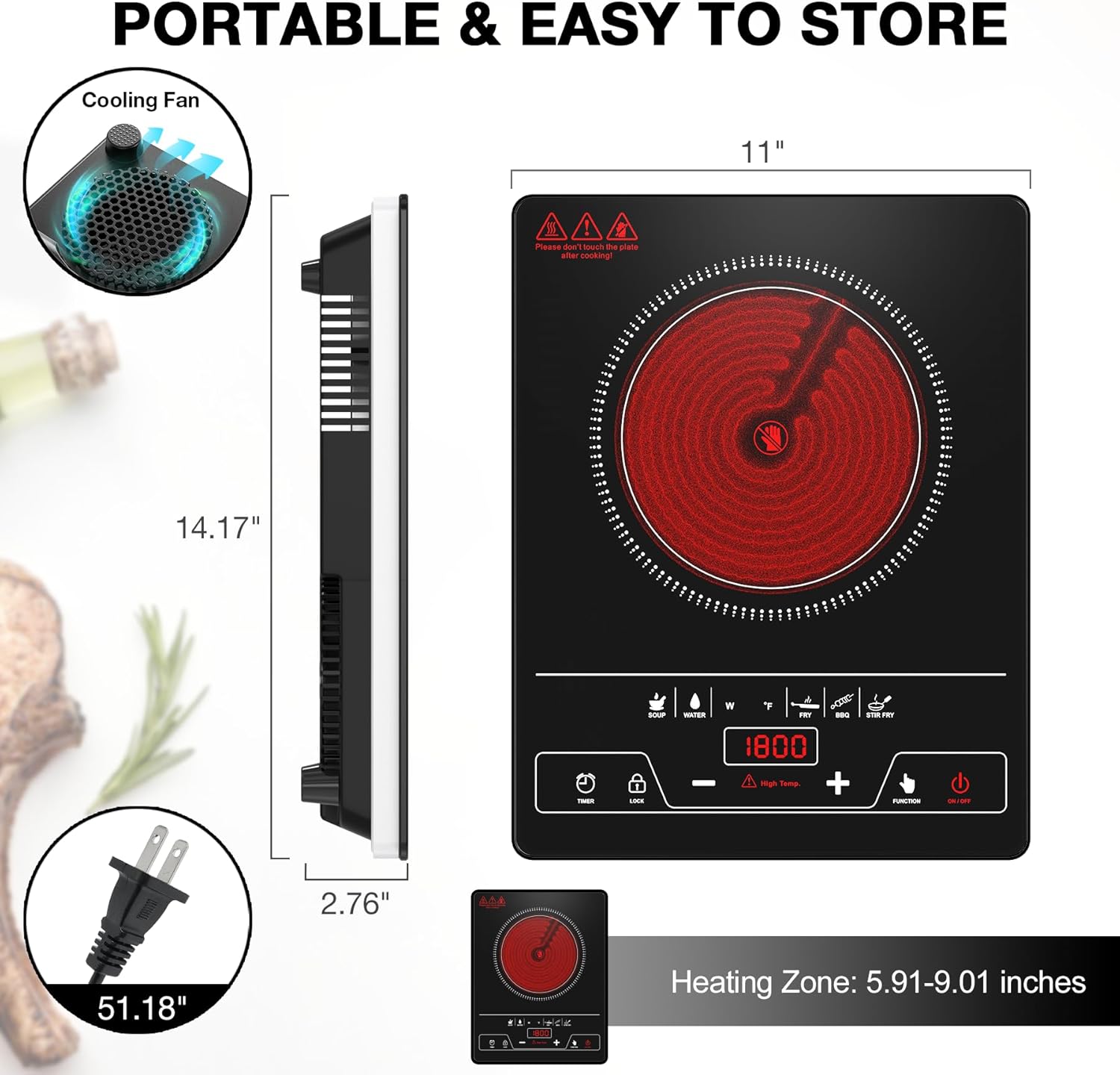 Safety and Durability:The electric portable stove top is built-in multiple safety protection measures, such as overheat protection, residual heat indication, auto shut-off and child safety lock, to ensure the safety of you and your family. single burner electric stove bottom is also equipped with a cooling fan, which effectively extends the service life. cook top stove electric crystalline surface can resist high temperatures and is more durable to use