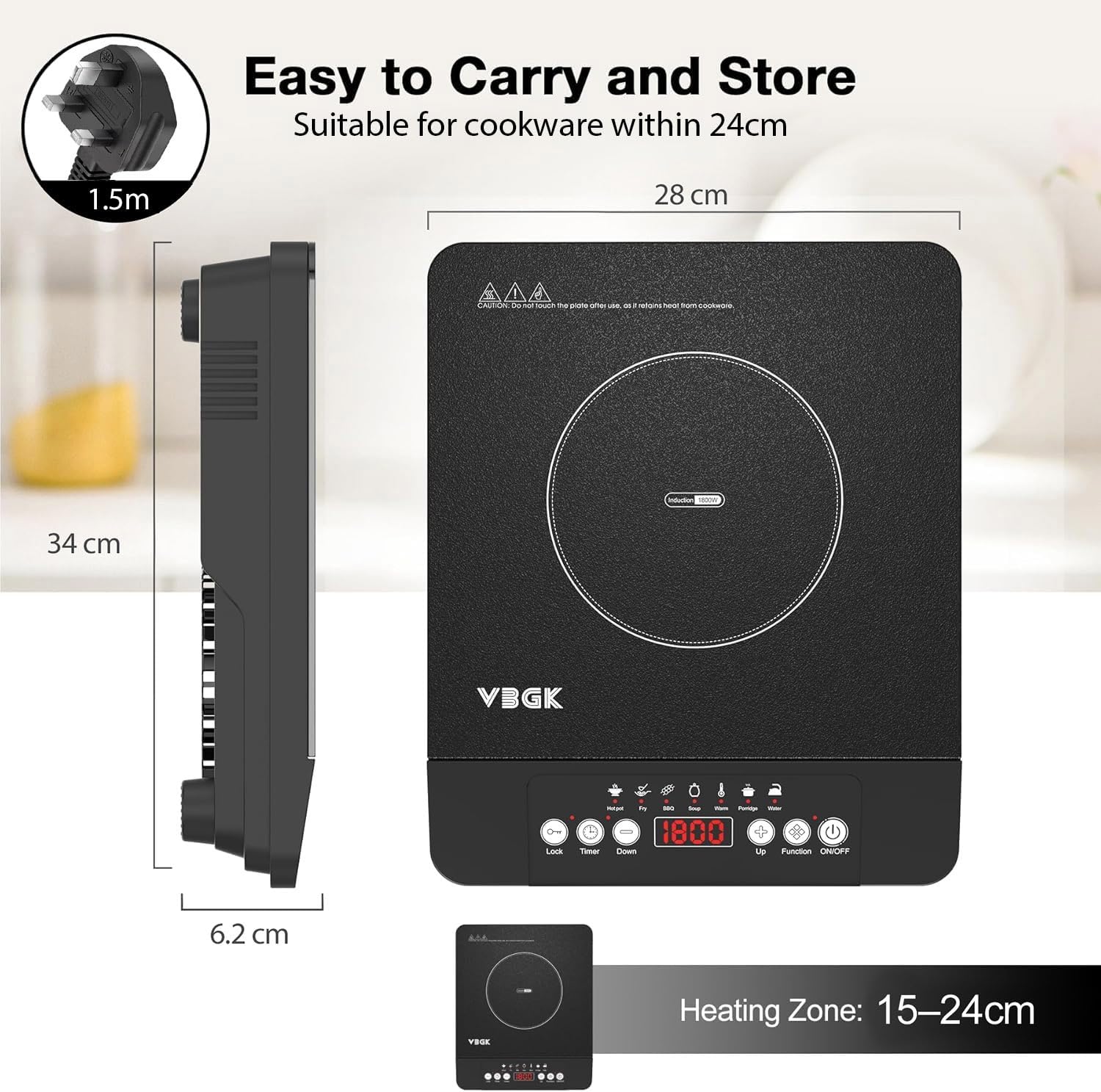 Digital Control Hot Panel: VBGK induction cooker can choose from 7 power levels (100 to 1800 W) and 7 temperature level settings (176 °F to 518 °F). Portable induction Cooktop is more efficient than traditional gas or electric stoves. Built-in count-down digital timer with 1 minute increments up to 240 minutes; cooling fan rapidly dissipates heat to ensure a longer product life.