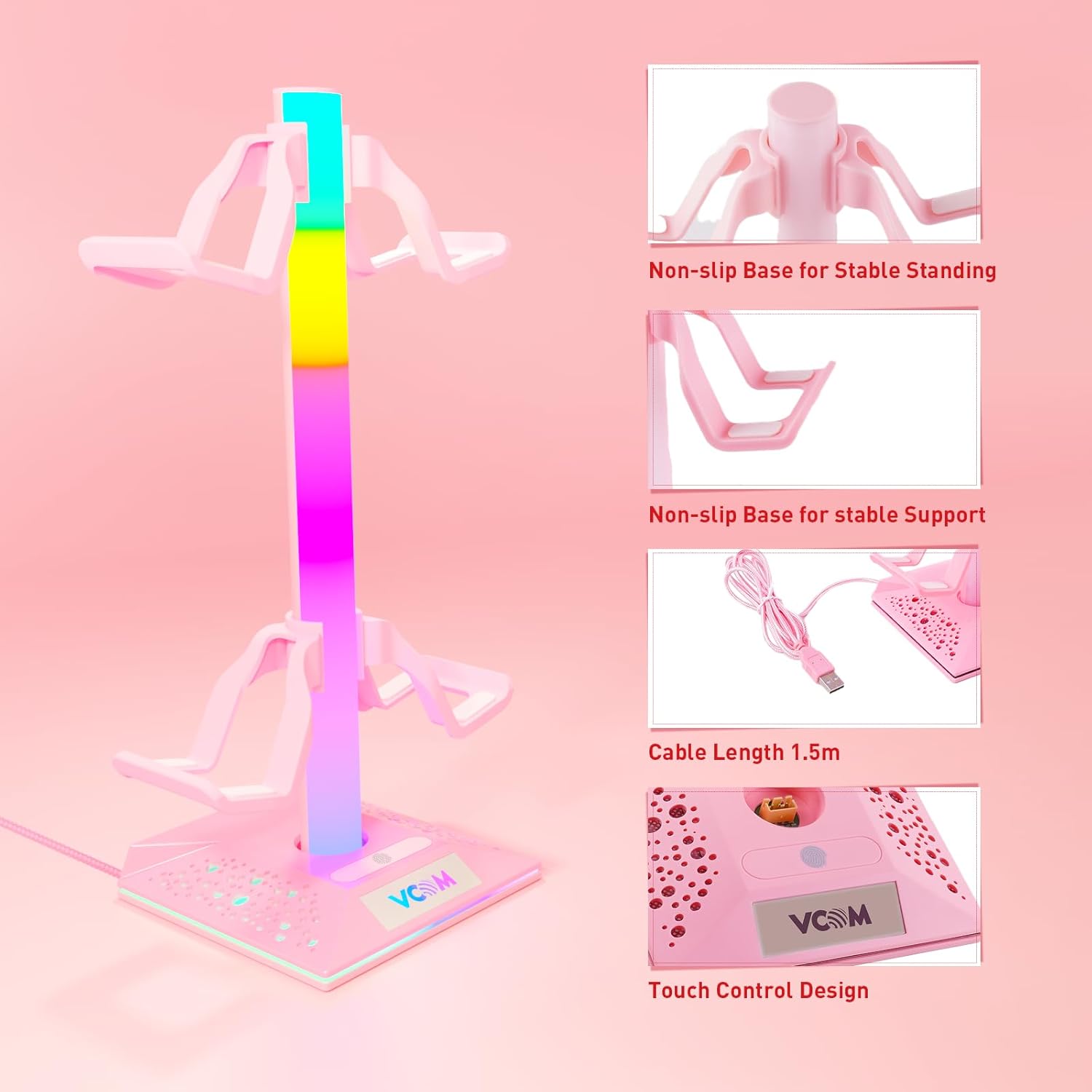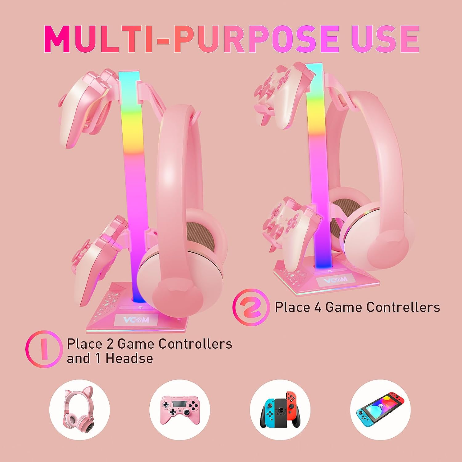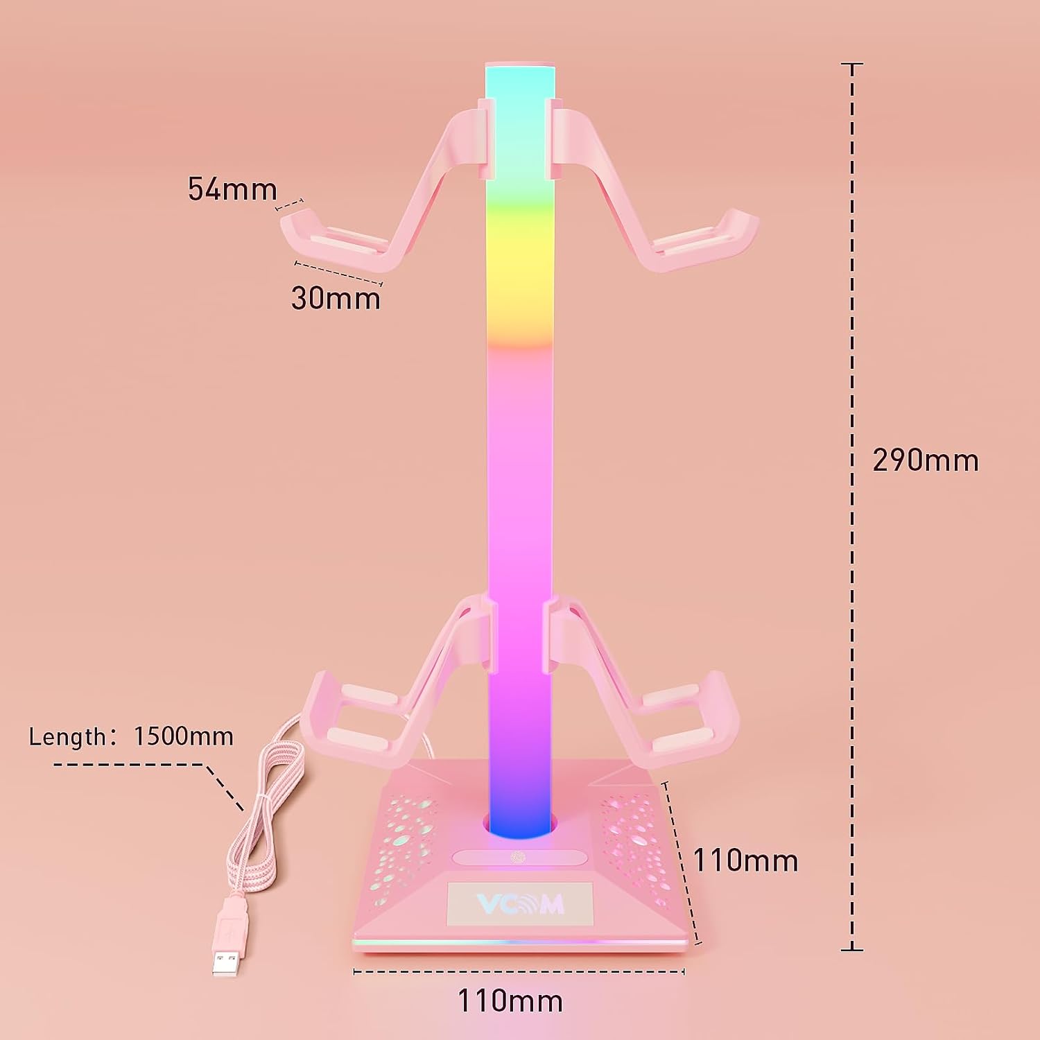 VCOM RGB Gaming Headphones Stand with 2 USB Ports, Pink Headset Stand with 10 Light Modes and Non-Slip Rubber, Suitable for PC Desk Accessories Gamers Gift(Pink)