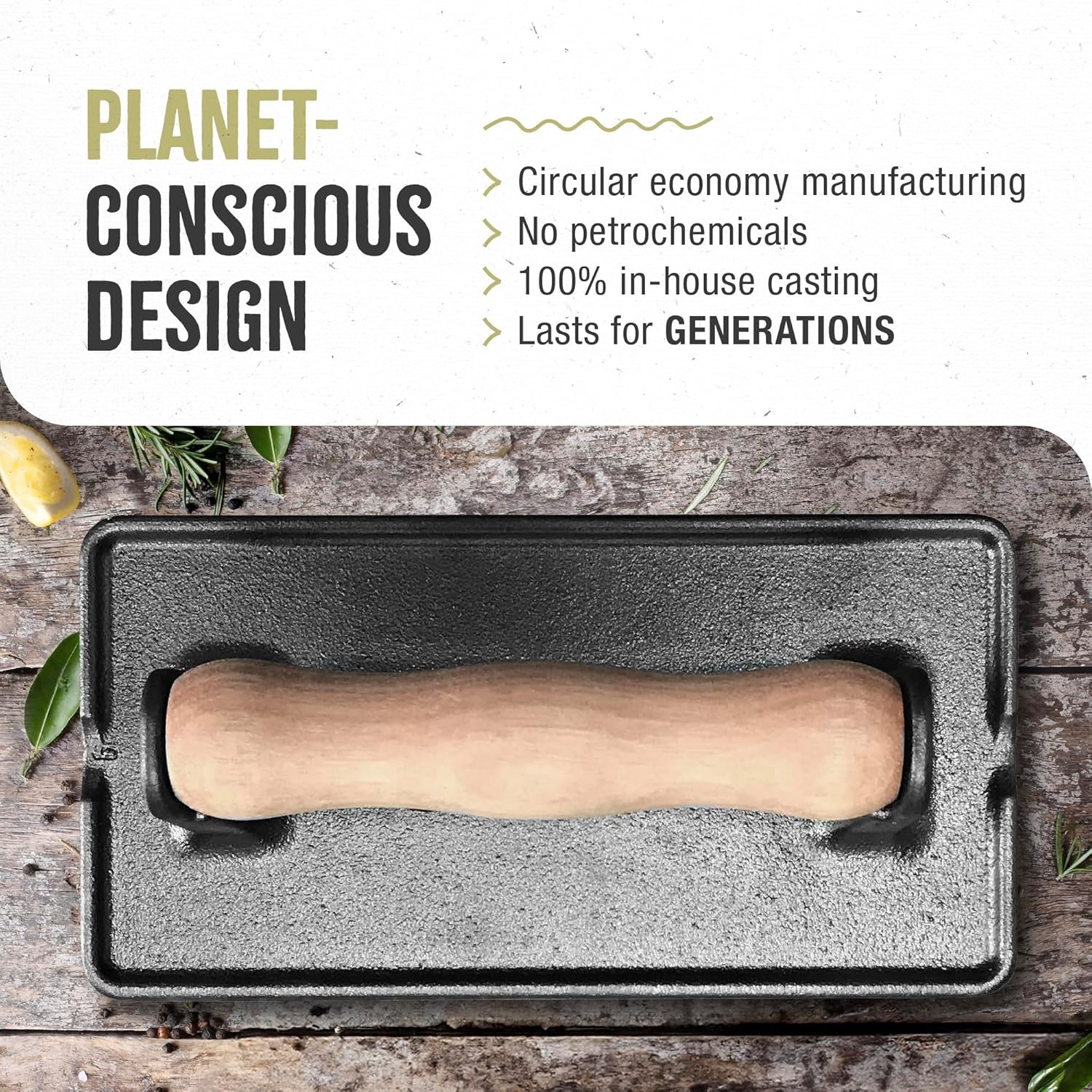 MADE FOR GREAT MEALS: Preheat our cast-iron bacon press by using indirect heat for faster and more even cooking. This rectangle meat press features a removable natural wood handle and a textured bottom that helps prevent the press from slipping.