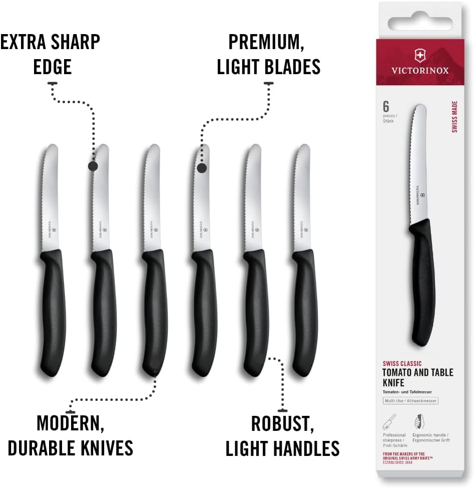 Practicality, durability and classic ergonomic design in one table knife. This new Swiss Classic Tomato and Table Knife Set packs six of the finest blades into one compact collection that is as ideal for entertaining as it is for every day. Use it in the kitchen for preparing your meal or as a multifunctional table setting for healthy starters, crusty snacks or even dinner parties. The wavy edge cuts through a variety of soft and hard textures like a slicing pro, and the dishwasher-safe material lets you enjoy dinner from beginning to end.