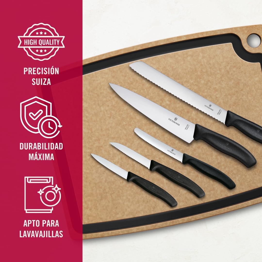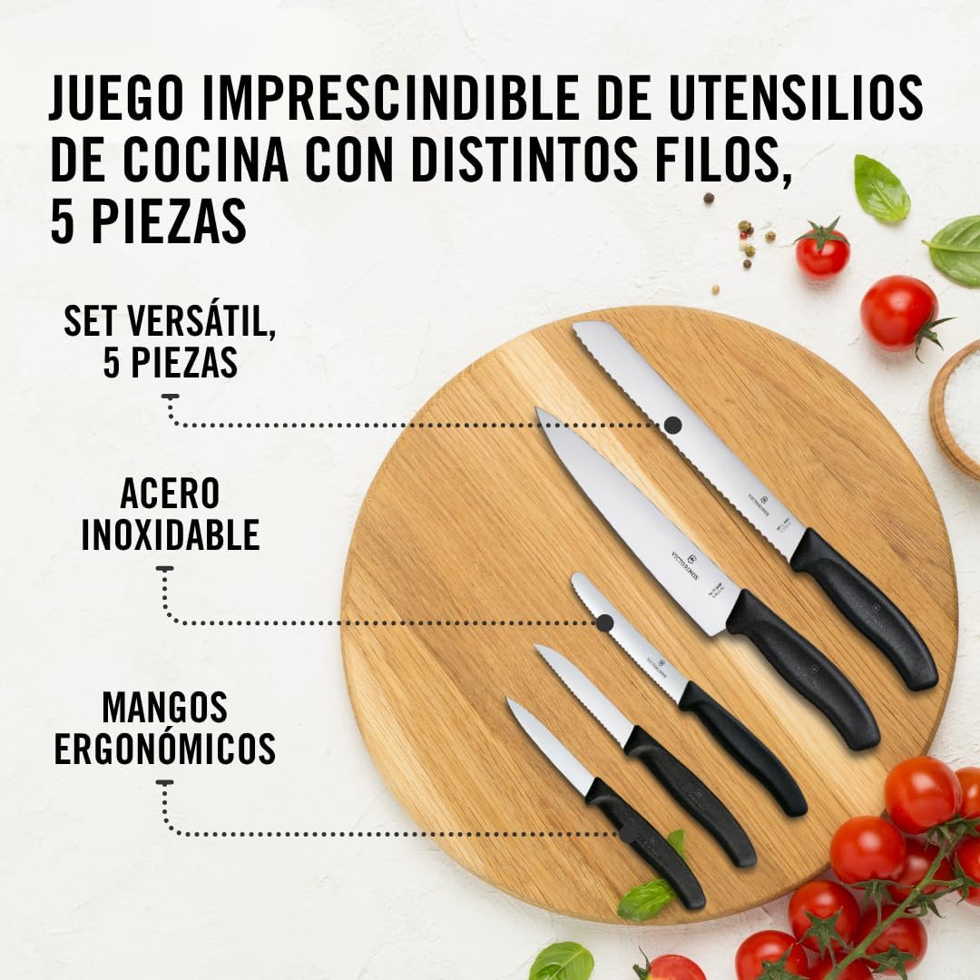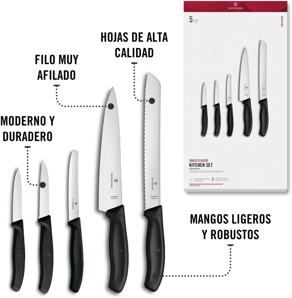A set of super dexterous knives is the building block of your kitchen. They underpin all your culinary creativity (and dish dreams). you want blades that go the distance and are a pleasure to use. Our Swiss Classic kitchen Set, 5 pieces, is the natural choice. Containing all the essentials for you to chop, slice, dice, peel and pare your way to everyday dining perfection. Multi-use. The optimal knife set to kick-start your kitchen chopping skills. Quality. Swiss made kitchen knives and accessories. Comfort. With ergonomic handle and stainless steel blade. Optimal combination of different edges for the kitchen. Swiss made Paring knives with various edges. With ergonomic handle and stainless steel blade. Victorinox age s all knives and tools to be of first class stainless steel and also s a life time against any defects in material and workmanship (save for electronic components 2 years). damage caused by normal wear and tear, misuse or abuse are not covered by this.