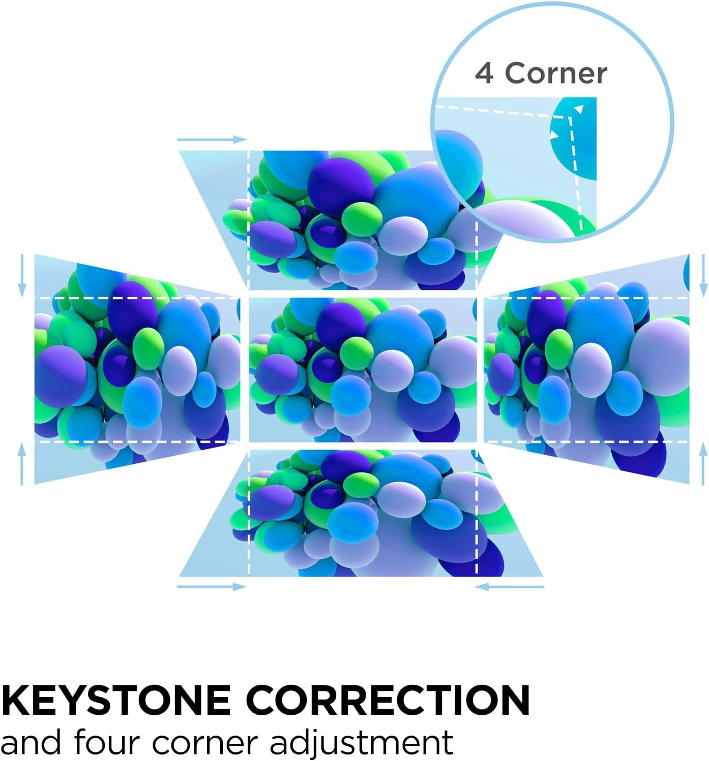 Easy Setup & Image Adjustment: Features 0.8x–2.0x digital zoom, horizontal/vertical keystone, and 4-corner correction for flexible setup