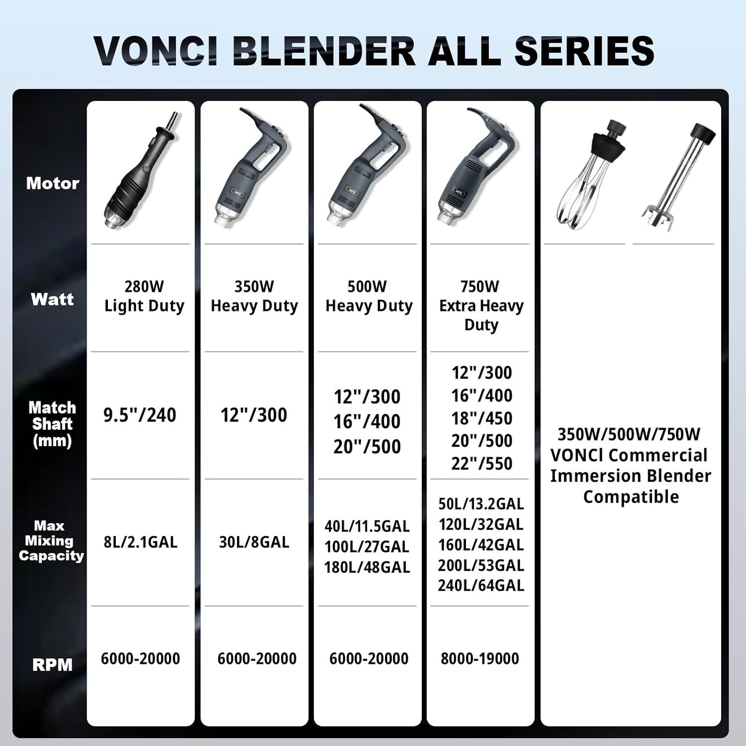 Efficient Power – VONCI 120V commercial immersion blender use 750 watt pure copper motor to quickly mix ingredients and save you time. This commercial hand blender has a variable speed regulation of 8000-19000RPM, and the speed is controlled by the speed button on the top to meet your different needs