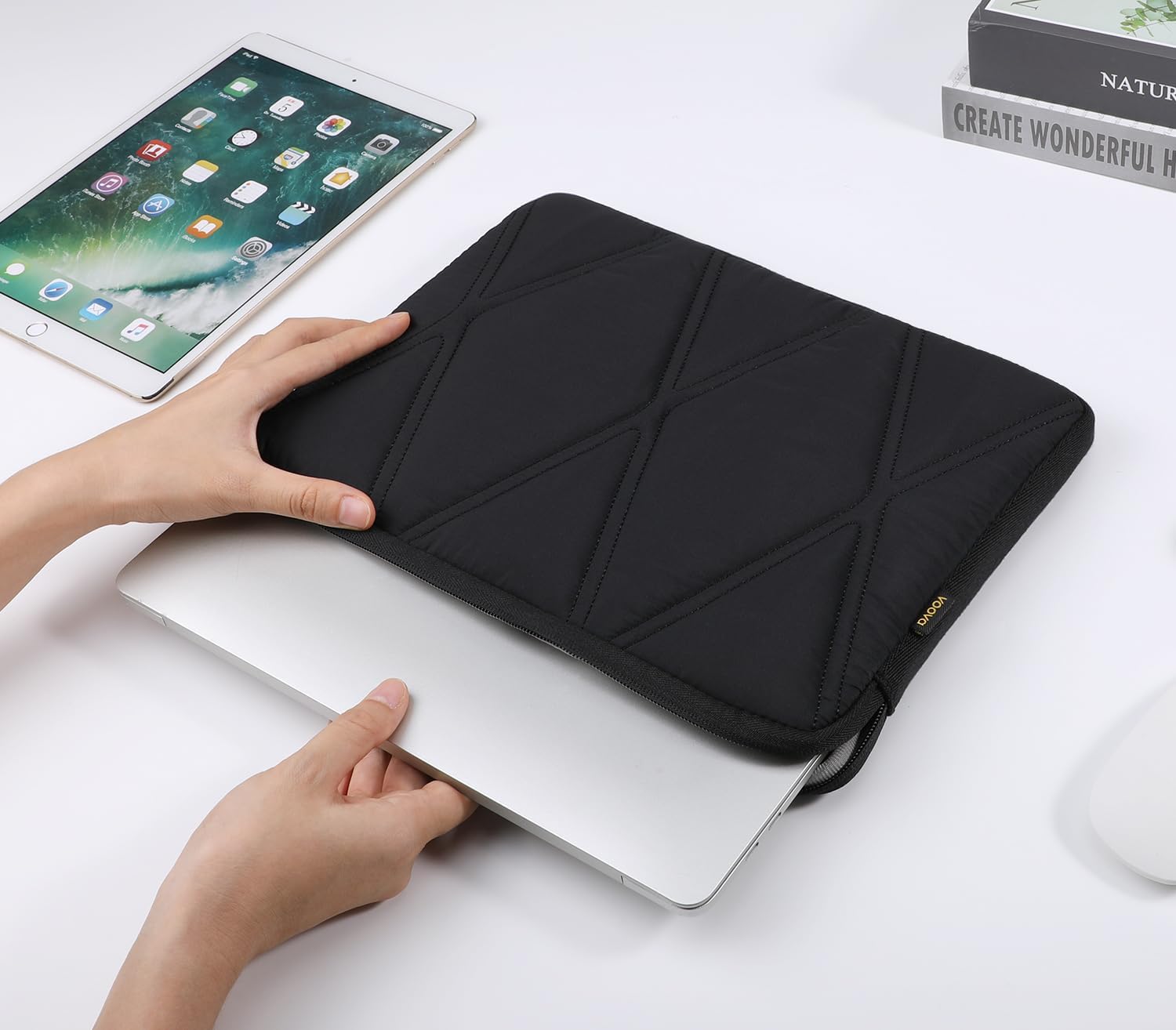 Voova laptop case is built with 4 layer material, outside unique quilted puffer, stitching pattern design, middle two layers are a polyester foam filling layer and a nylon backing layer,which are elastic and stretchy. innermost layer is soft flannel to protect computer surface andscreen.