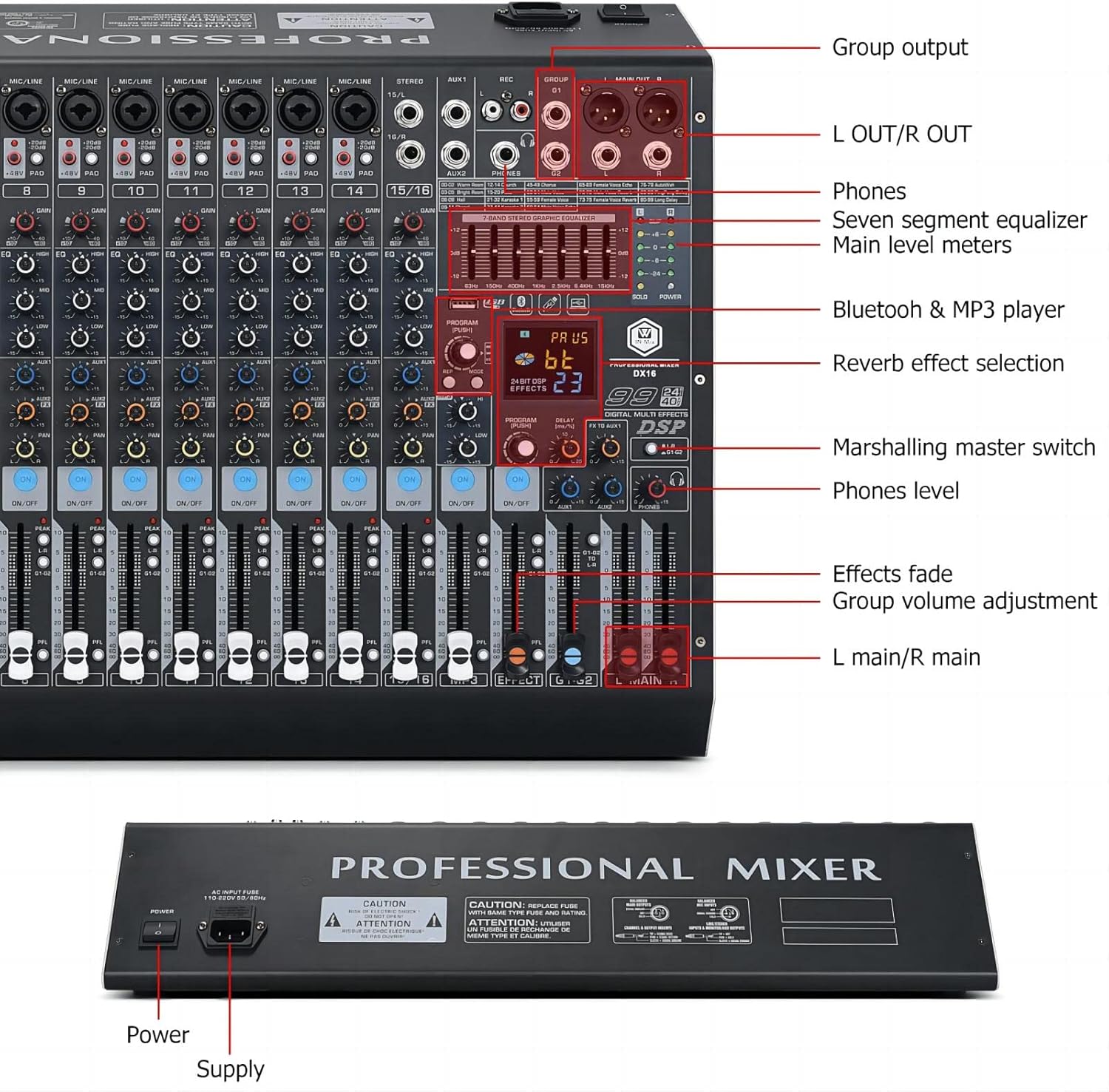 W IN-MIX DX16 Professional DJ Audio Mixer 16 Channel with 99 DSP Effects,7-band EQ,Independent 48V Phantom Power&Mute Button,Bluetooth Function,USB Interface Recording For Studio & Stage
