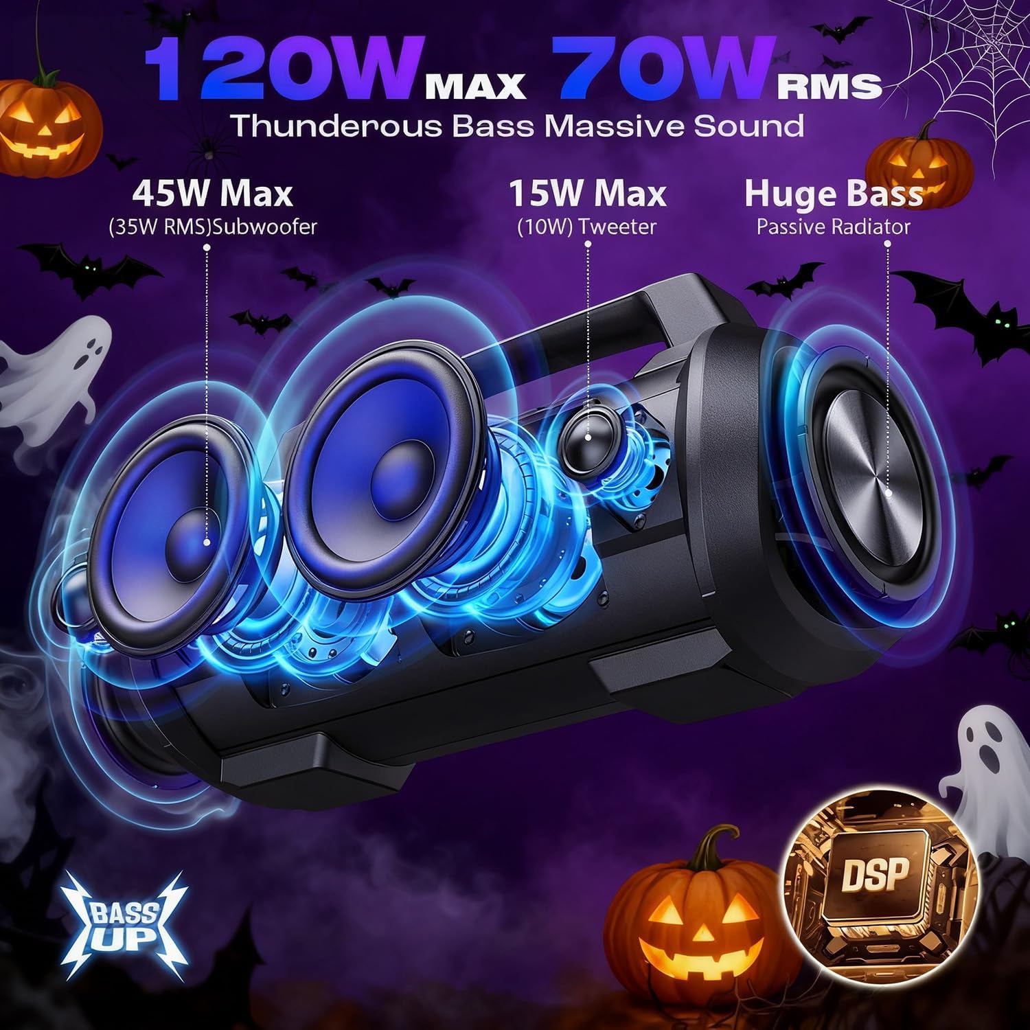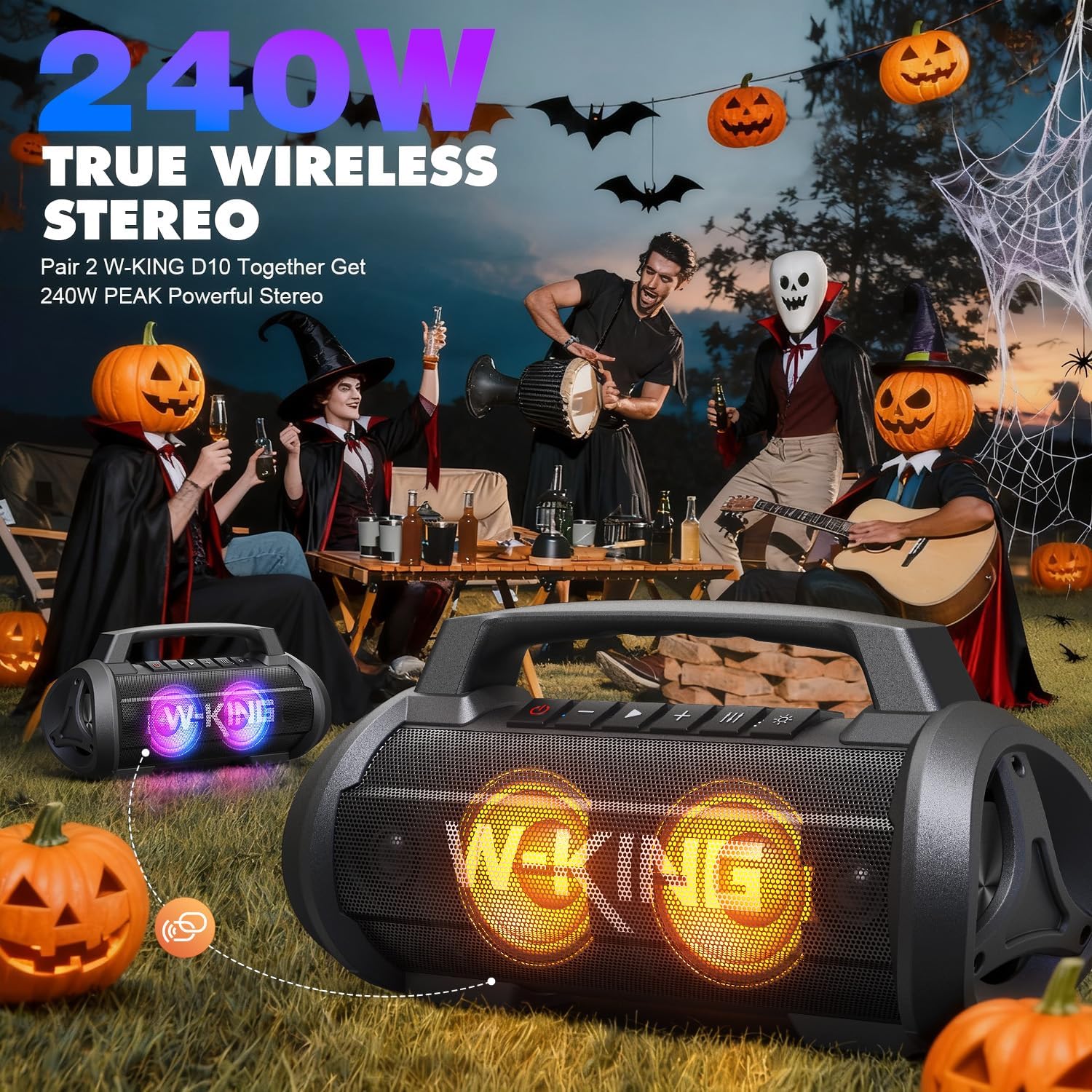 120W MAX DYNAMIC RUMNLING BASS & IMMERSIVE SOUND: Euipped with 4 premium drivers, W-KING D10 bluetooth speaker ensures that you hear every nuance of music, from deep bass to crisp highs. 2 large high-power subwoofers deliver deep, rumbling bass to ensure the music feels vibrant and full to give sounds richness and depth. With 2 tweeters, speakers bluetooth wireless produce clear and detailed treble,capturing every subtle high note with precision. The loud speaker is suitable for all music genres