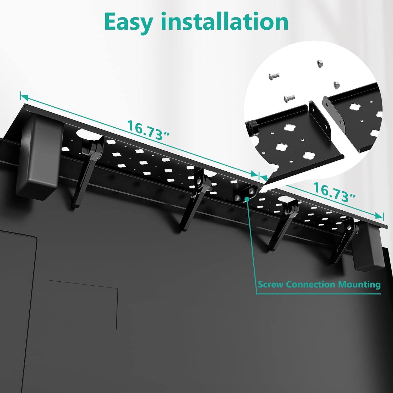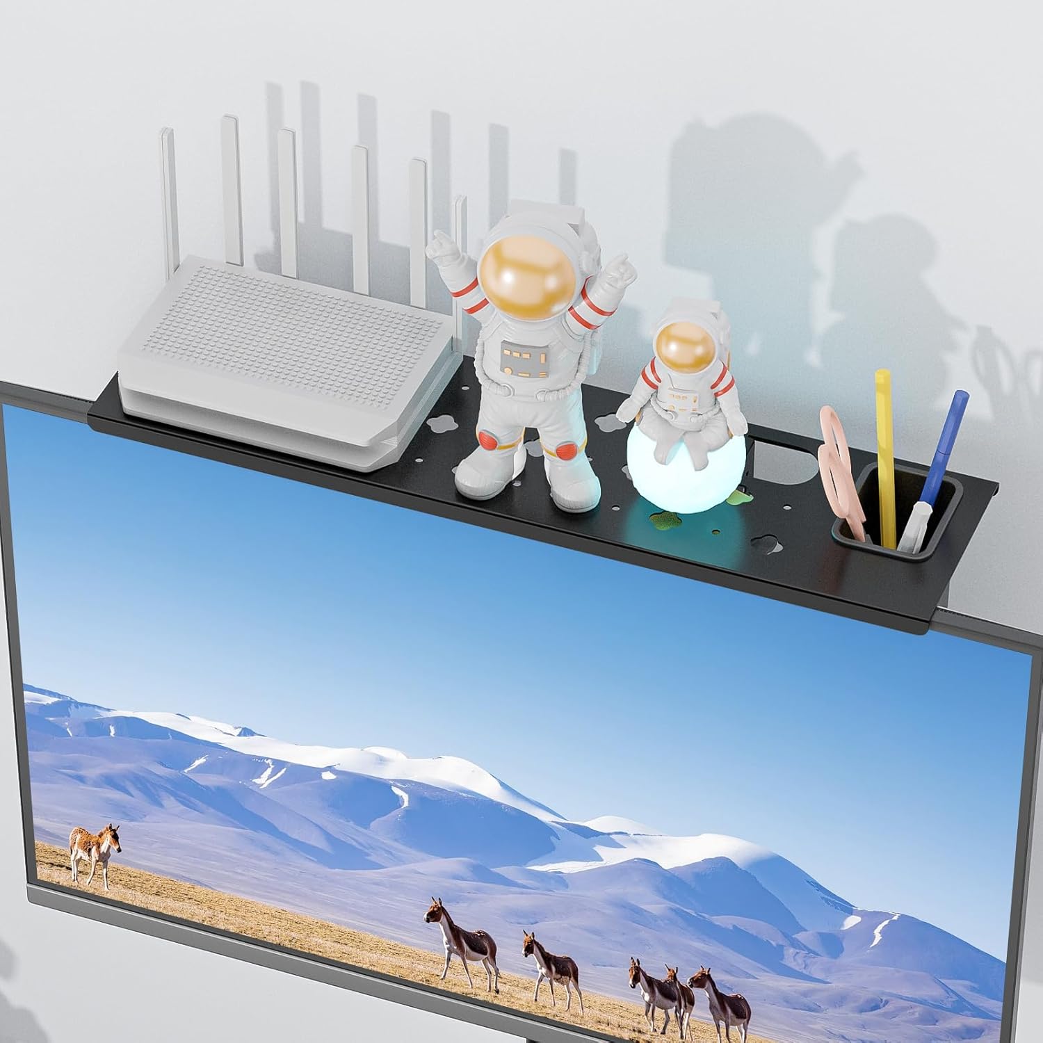 Usage: Monitor Top Shelf Composed of Two 17.33-Inch Brackets, the Longest Size Is 34.65 Inches. Suitable for Game Consoles; Soundbar; Speaker; Media Box; Remote Control, Pictures, Plants, etc. Not Suitable for Curved Panel Display