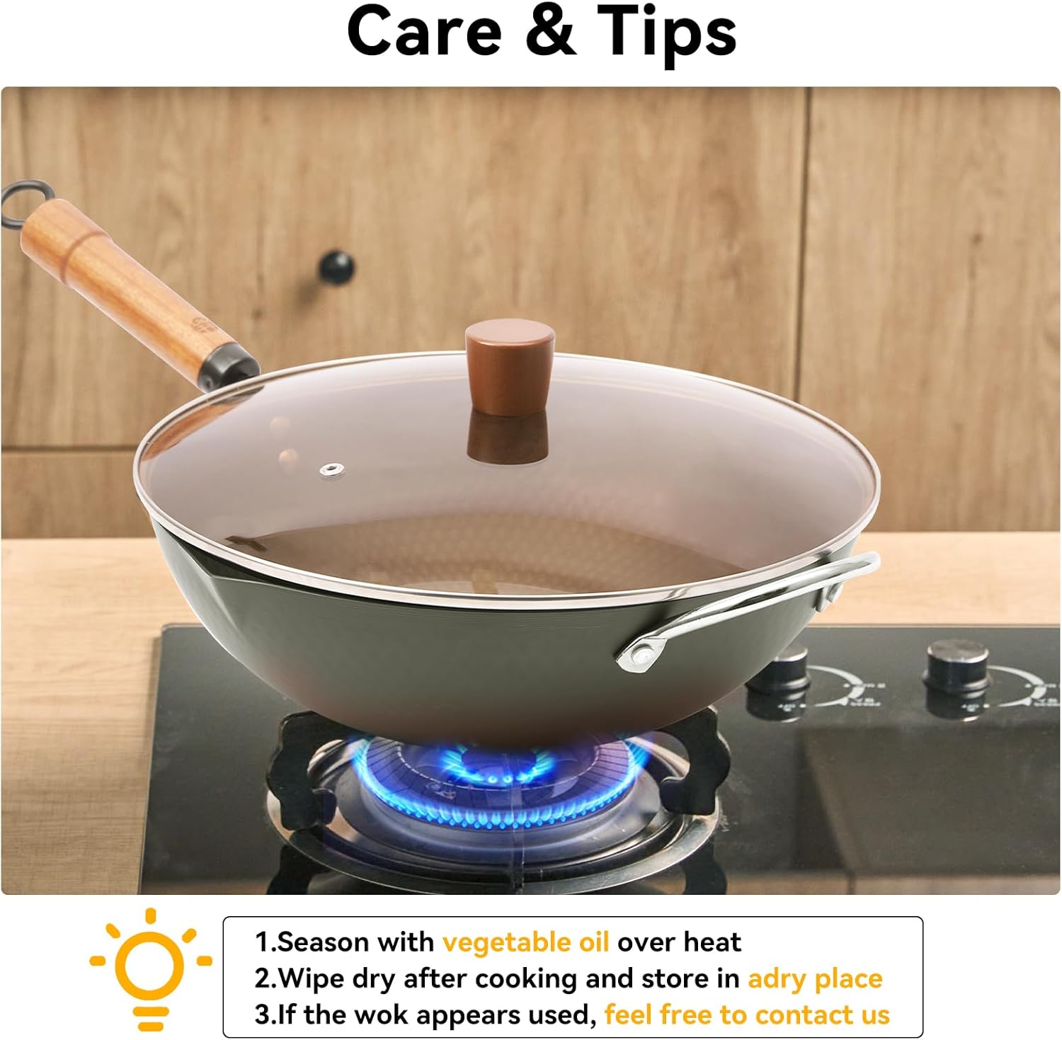 WANGYUANJI 12.6″ Wok with Lid, Flat Bottom Nonstick Wok Pan for Induction Cooktop, Stir Fry Woks & Pans for Cooking
