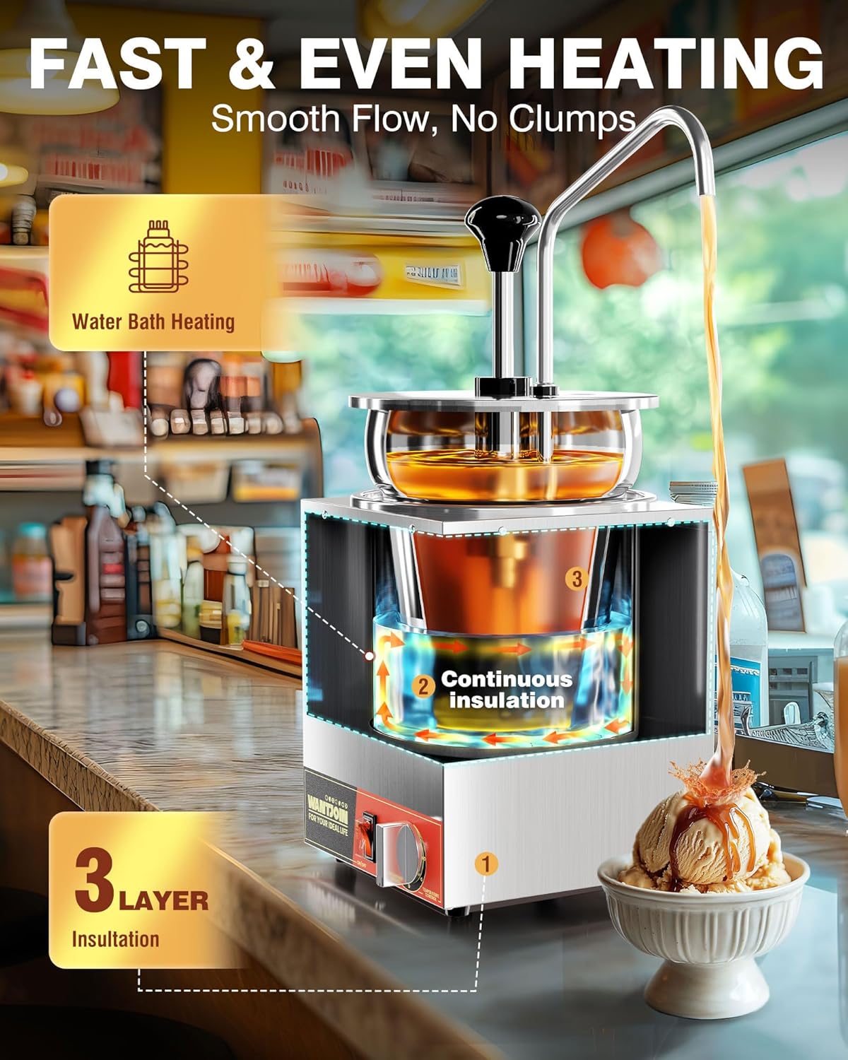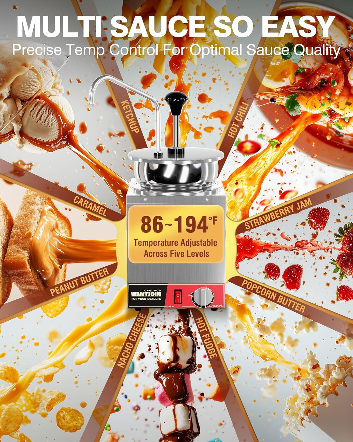 ADJUSTABLE TEMP CONTROL: Set the perfect heat from 86°F to 185°F (30°C-85°C) using the easy-turn dial—ideal for nacho cheese, caramel, hot fudge, and more. Heats up quickly and maintains steady warmth to keep sauces smooth, flavorful, and always ready for serving during busy hours.