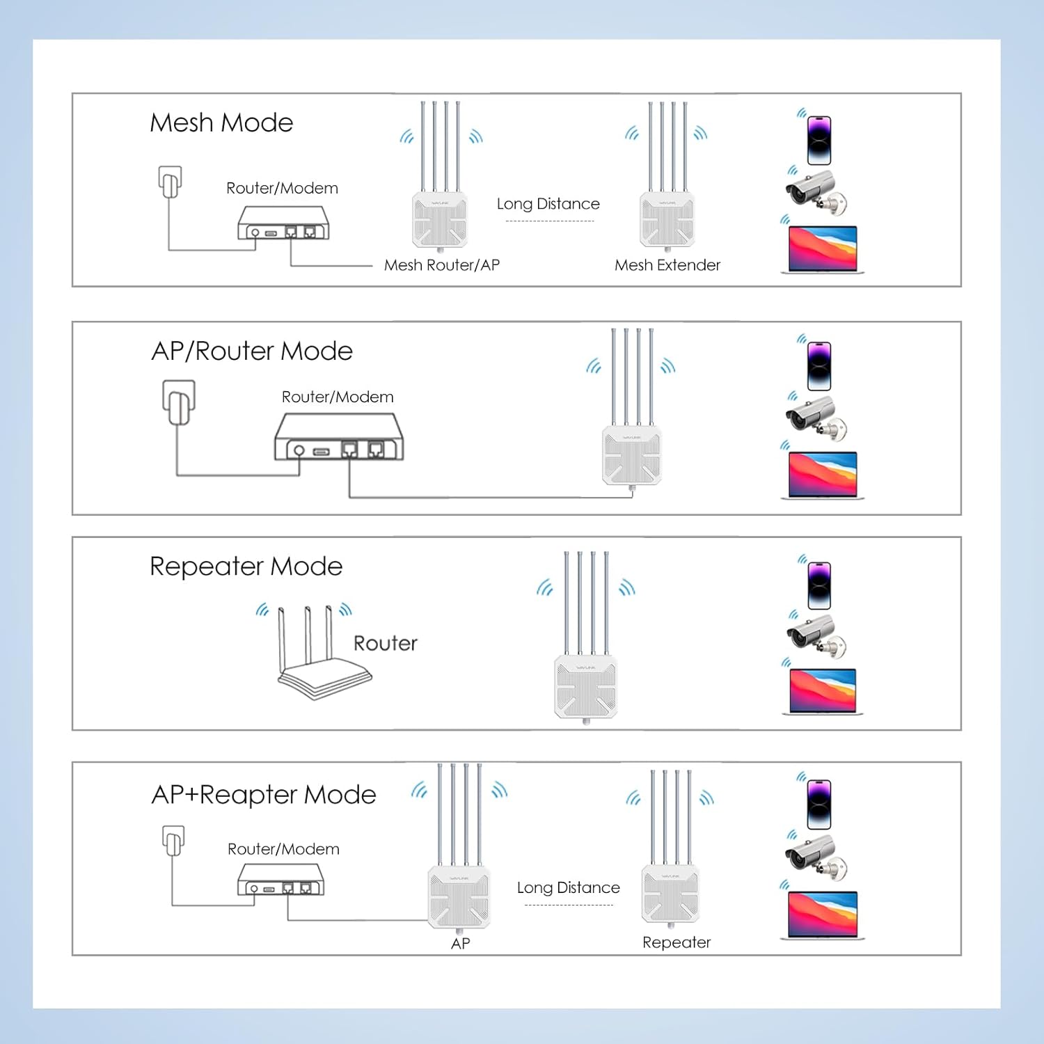 【Versatile Modes for Every Need】Adaptability meets innovation with the WAVLINK WN573HX3. Whether you’re setting up camp or extending your network coverage in a bustling urban landscape, this device offers unparalleled flexibility. With support for Mesh, AP, Router, Repeater, AP+Repeater, and other modes, it effortlessly caters to diverse outdoor scenarios. Plus, its IP67 waterproof enclosure, 15kV ESD protection, and 6kV lightning protection ensure uninterrupted performance, rain or shine. NOTE: Our device could form Mesh system with specific WAVLINK device, and it could not support to form a Mesh system with device of different brands