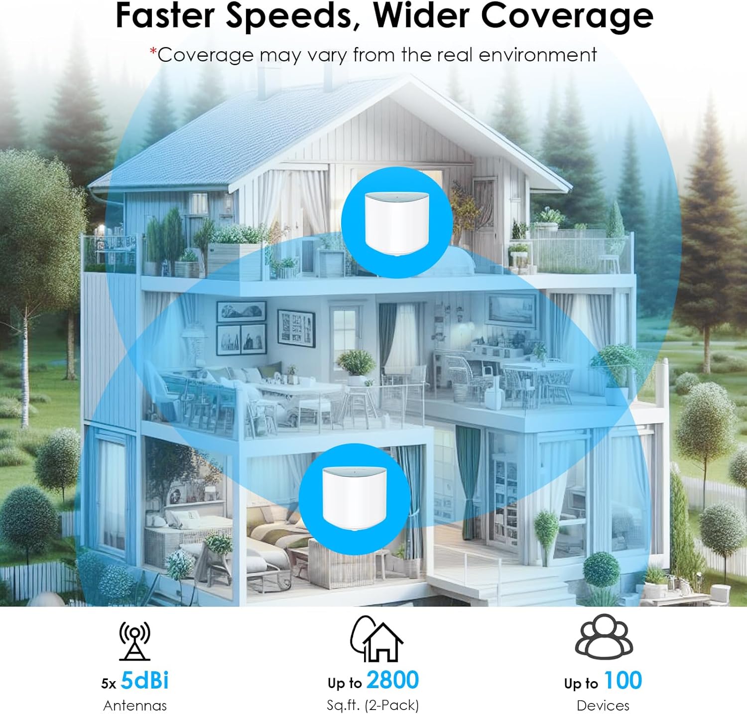 【Wide WiFi signal coverage】One mesh covers 1500-2000 sq.ft., two meshes cover 3000-4000 sq.ft.