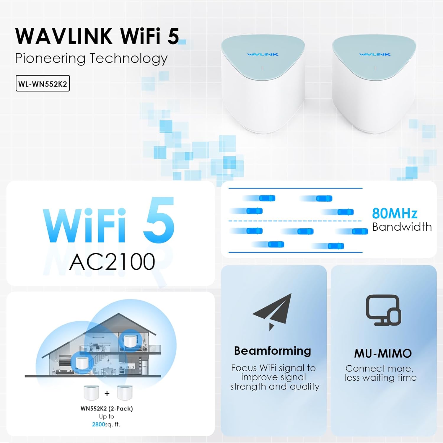 【2 Units Dual-band AC2100 Wi-Fi 5 Mesh System】Simultaneous 5GHz 1733Mbps and 2.4GHz 300Mbps connections, total available bandwidth of 2100Mbps.