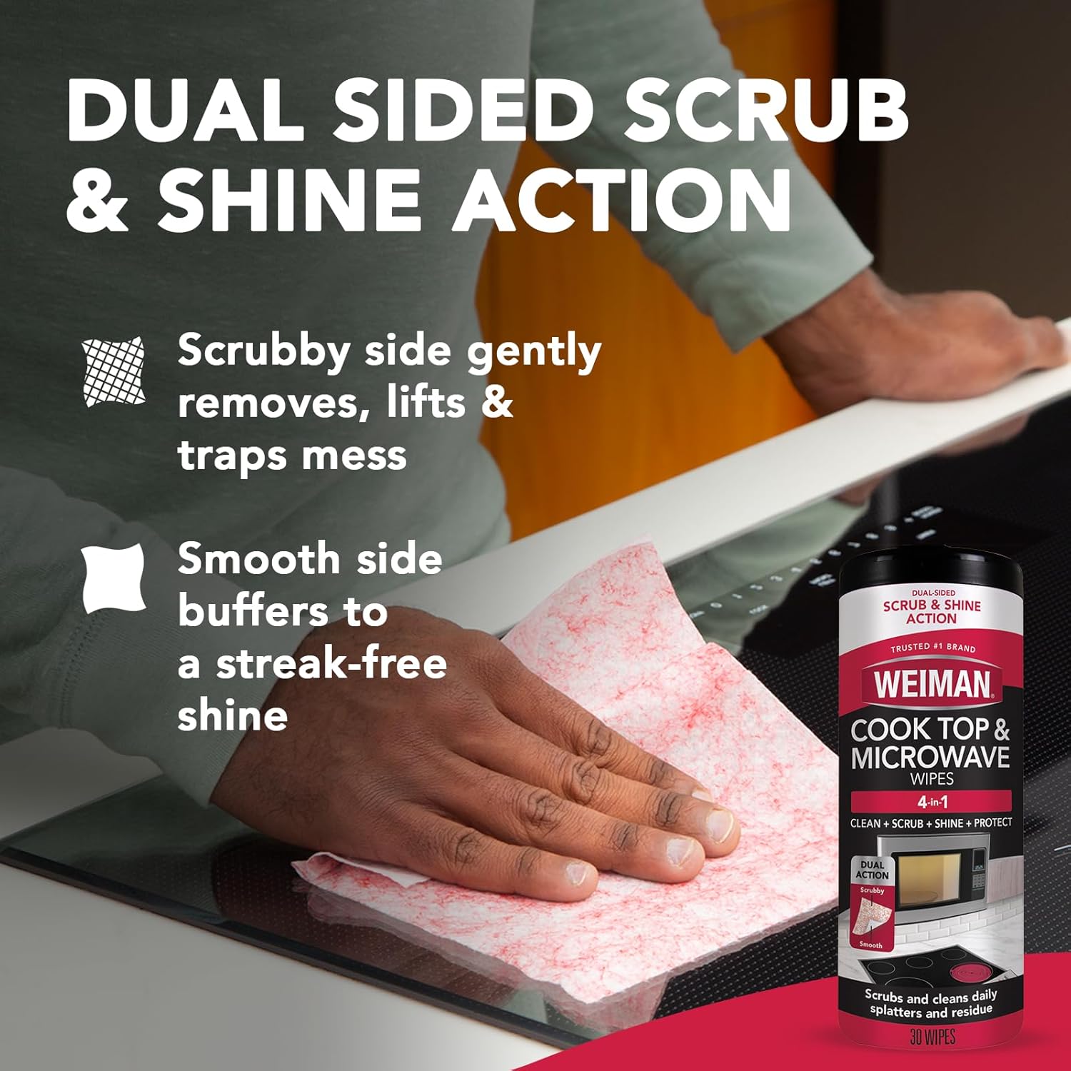 Weiman Microwave & Cook Top Wipes are perfect for quick everyday clean ups & specially formulated to remove splattered food and spills, allowing you to achieve the perfect results your home deserves. A unique, non-toxic formula, safe to use regularly on plastic and metal surfaces inside microwaves, all stovetop surfaces, any glass or ceramic smooth top range, and great for cleaning other kitchen surfaces such as formica, Corian, ceramic tile, chrome & granite. This product cleans with passion to reveal the superior shine of your countertop surfaces, making the Weiman Microwave & Cook Top Wipes an essential for everyday treatment. Weiman Products is the perfect home, chef, pro, scratch resistant, cleansing, household, professional, and at work solution for all of your cooktop cleaning and buffing needs.