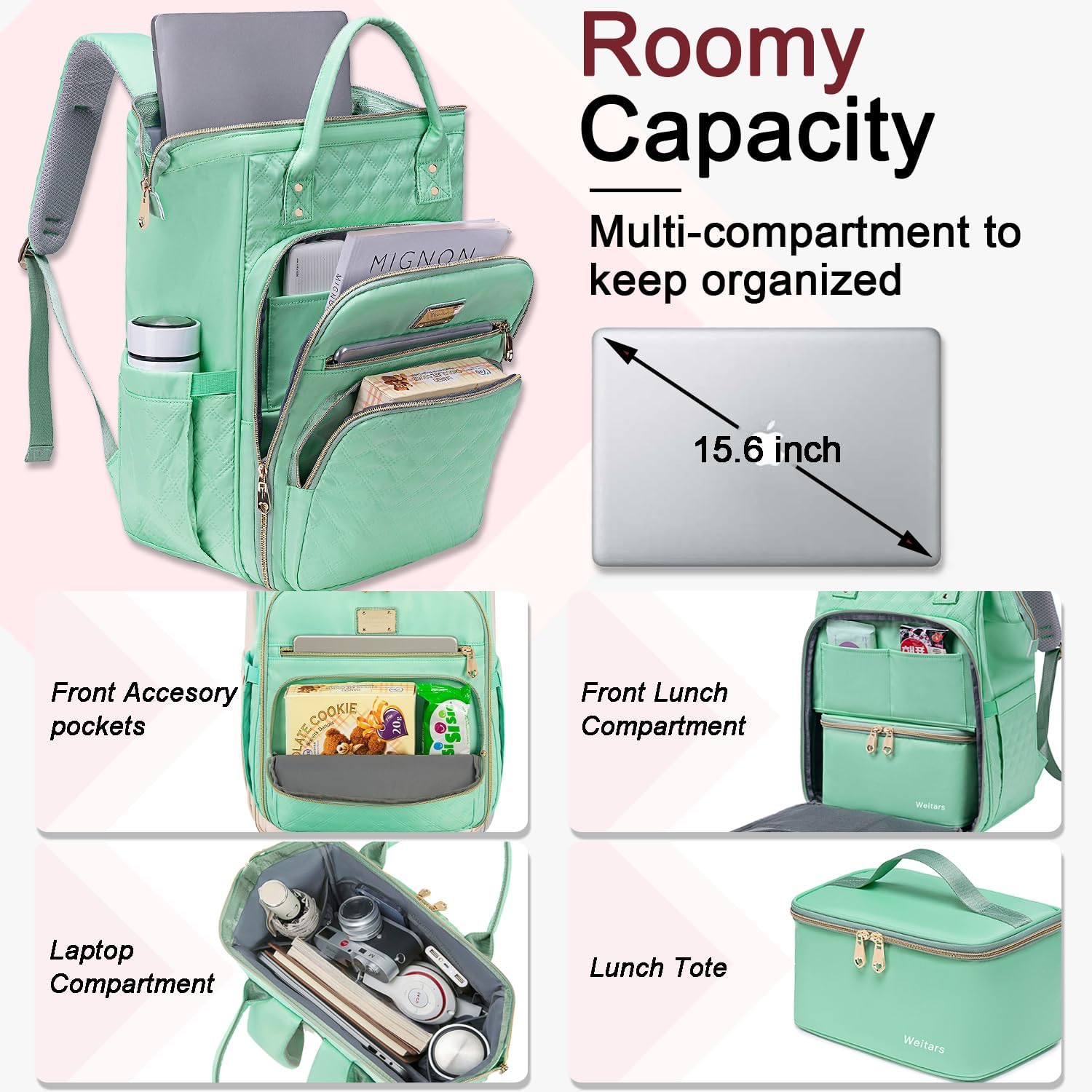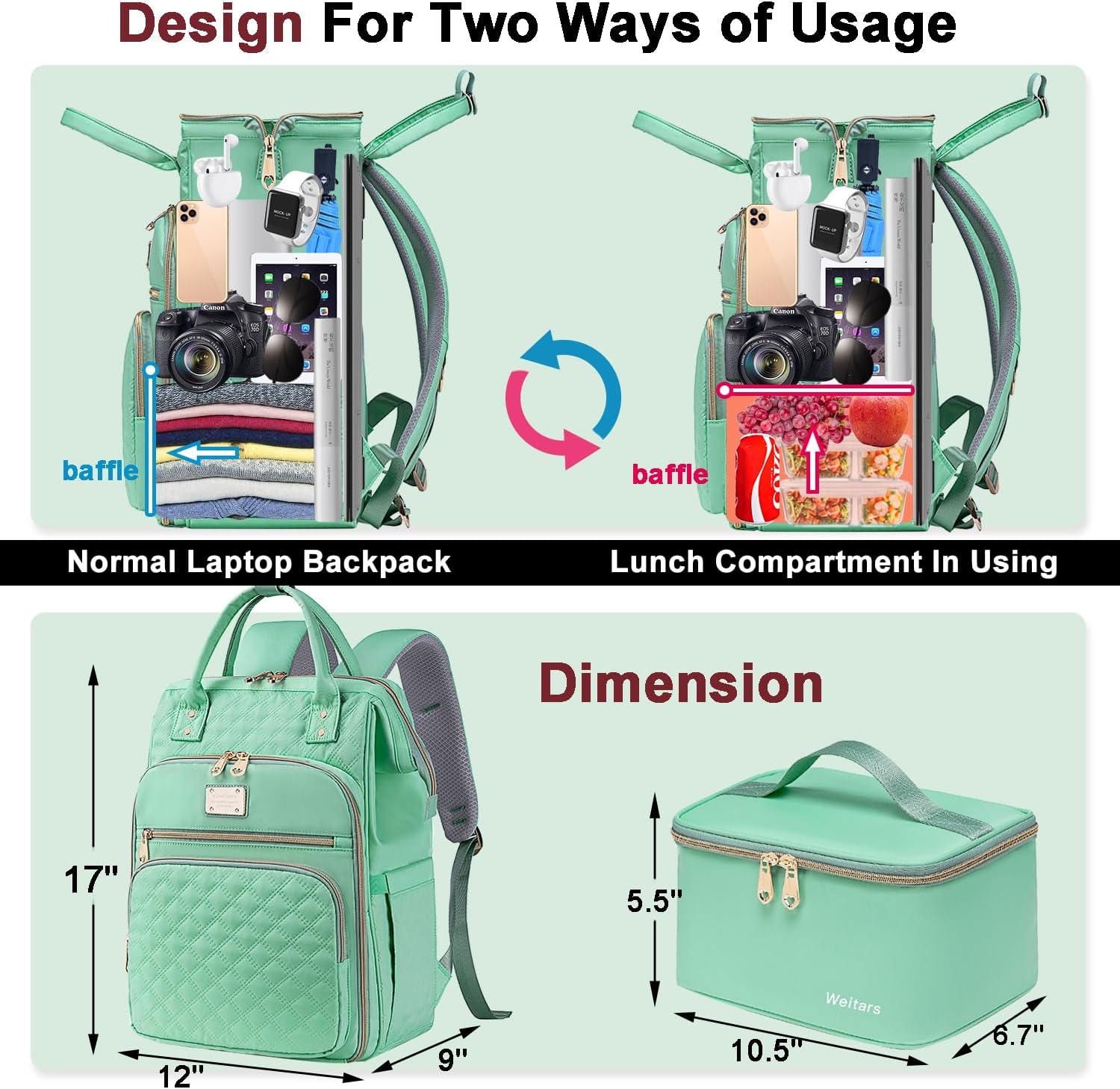 【Laptop Backpack With Lunch Compartment】2 In 1 Laptop Backpack With Lunch Compartment; The Work Backpack Measured By L12‘’ * W9‘’* H17‘’, And The Separate Lunch Bag Measure By L10.5‘’ * W6.7‘’* H5.5‘’ ; Good Fit As Lunch Backpack When You Put The Lunch Bag Into Women Backpack And Lift Up The Baffle Inside; And It Can Also Take It As Laptop Backpack For Women When You Put Down The Battle When You Take Out The Lunch Bag And Save Roomy Space