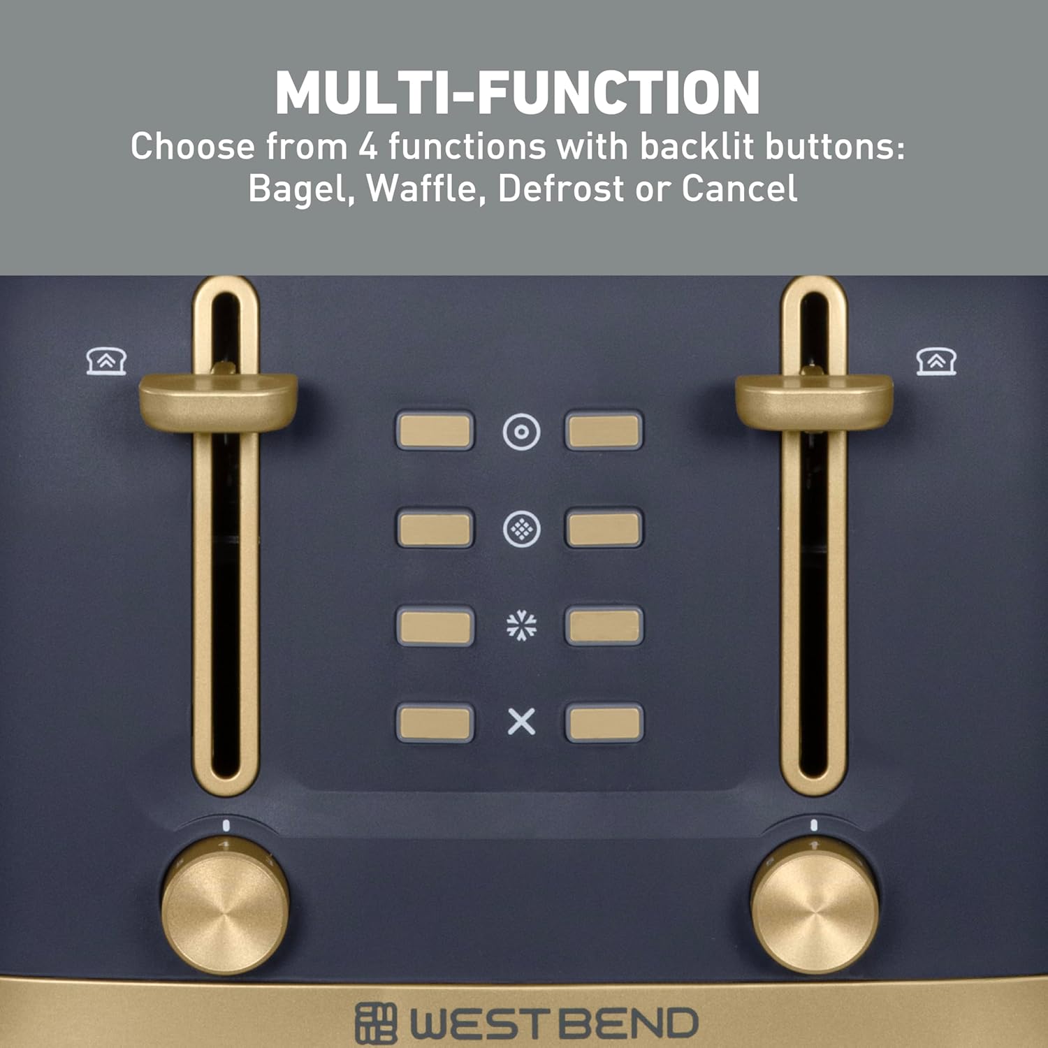 The West Bend “Timeless” Collection features elegant gold accents that will enhance any kitchen décor. Start your morning off with perfectly toasted treats with the West Bend Timeless 4-Slice Toaster. Simply designed, the user-friendly interface features four functions: Bagel, Waffle, Defrost and Cancel, with an LED light that illuminates when the desired function is selected. This easy-to-use toaster also has a shade selector knob with seven levels of browning to meet different needs. When your food is done, easily remove it from the toaster with the manual, high-lift lever. Anti-Jam and Auto-Shut-Off features provide added safety. Keep your toaster clean and crumb-free with the easy-clean removable crumb tray. This classic white toaster has gold accents, including a cool-touch handle, that will complement any kitchen. Covered by the West Bend 12-Month Limited Warranty.