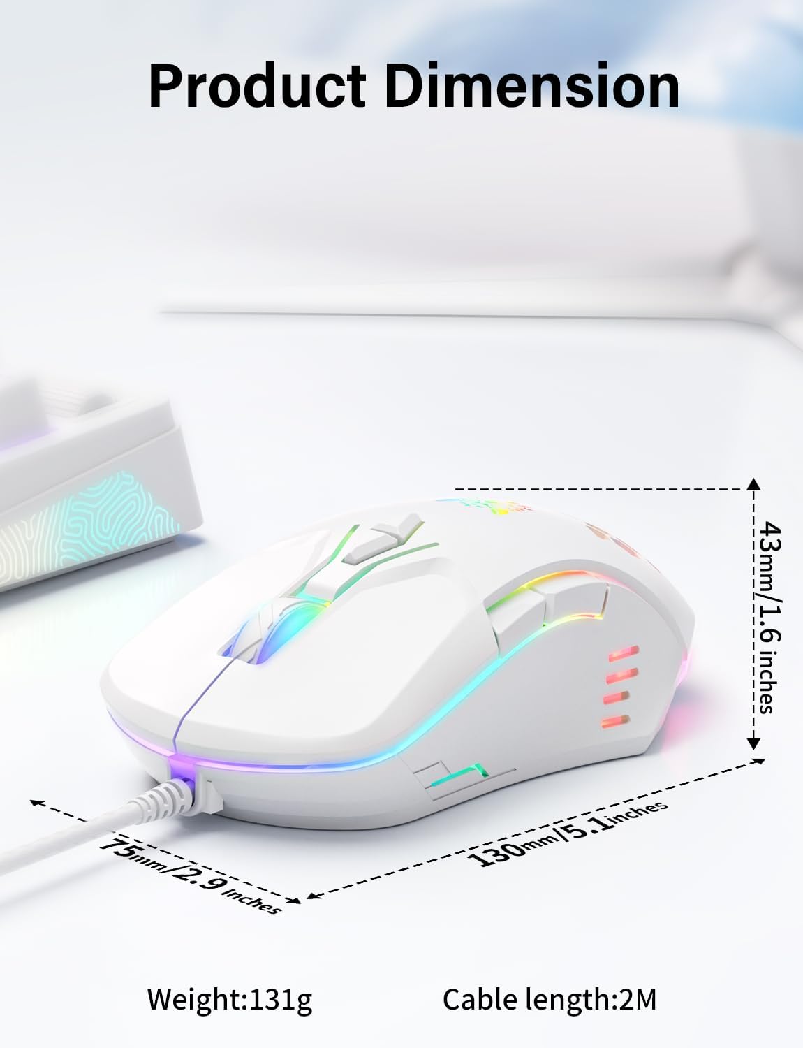【Cool RGB Lighting】When the wired usb mouse is plugged into the device, gradient dynamic RGB light will light up to enhance the ambience and gaming experience. Press DPI- button for 3 seconds to enter low light mode.