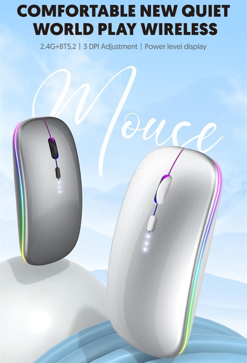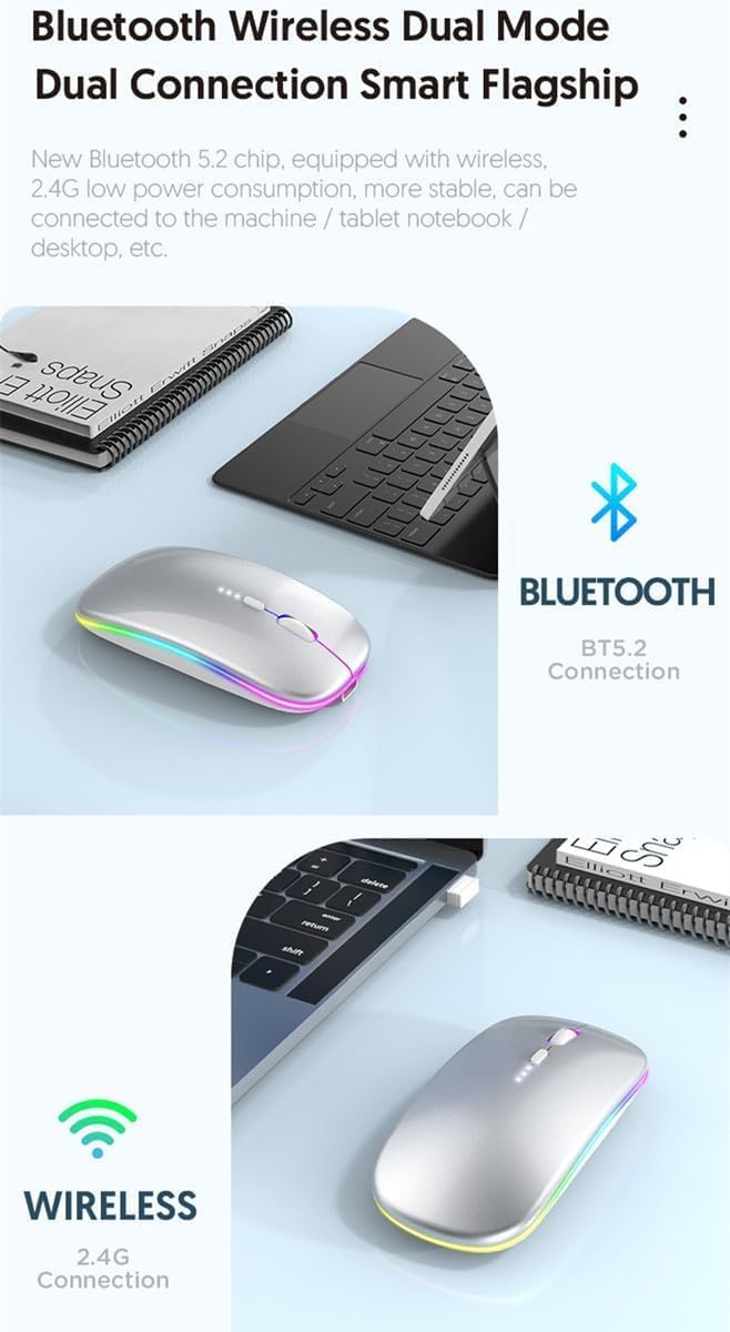 【Wireless Bluetooth Mouse Dual Mode】:Mouses(BT5.2/3.0+2.4G)Dual Mode Realize the Free Switching of One Wireless Bluetooth Mice Between Two Devices.Bluetooth Mouse Mode Can Connect One Device Through BT5.2/3.0 and Wireless Mouse Mode Another Device Through a 2.4G USB Receiver,No Need to Install any Driver,Plug and Play.Wireless/Bluetooth Technology Provides Powerful and Reliable Connection,Which Can Enables Fast Data Transmission Without Delays or Dropouts,Effective Up to 10 Meters(33 feet)of Range.