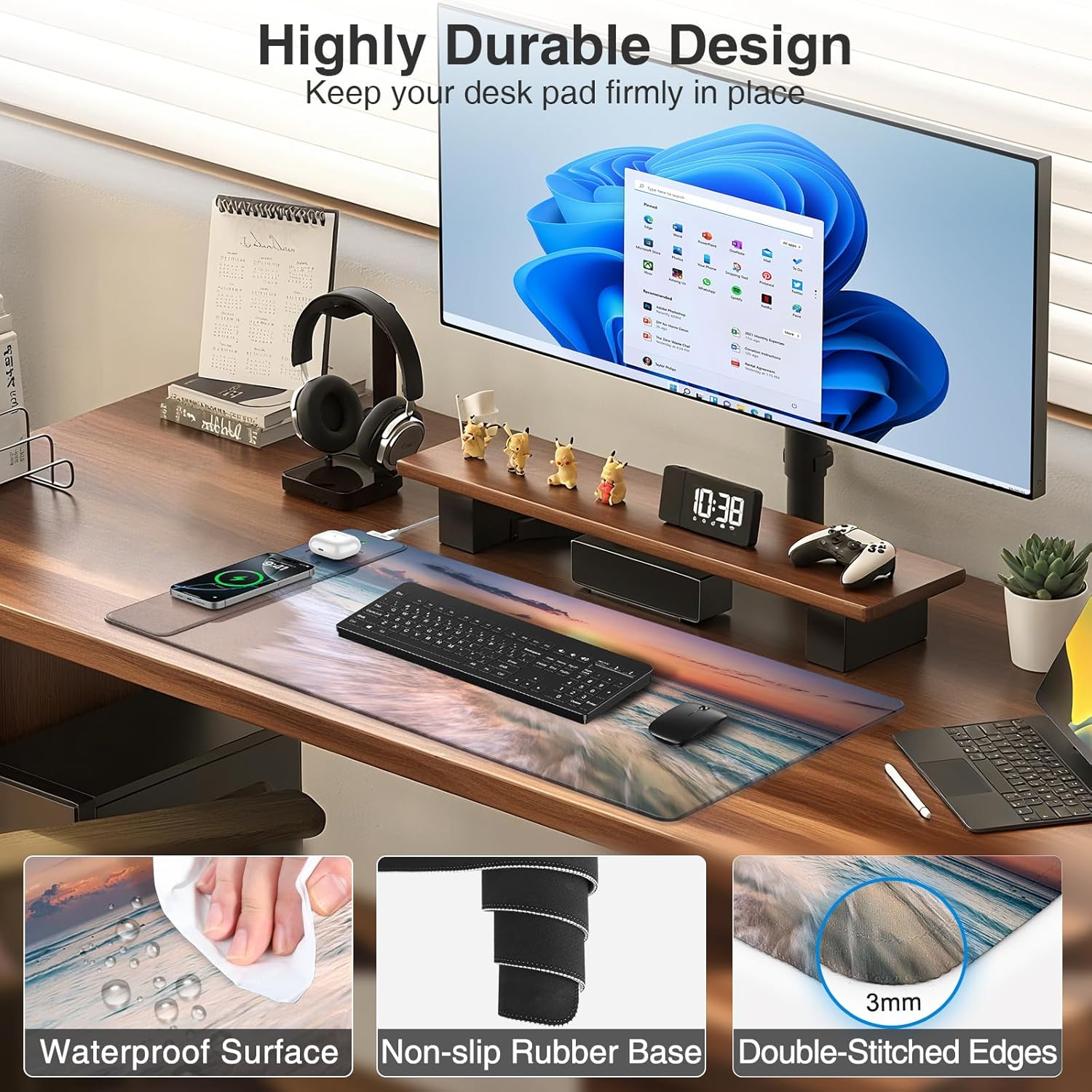 Wireless Charging Mouse Pad, 31.5″x15.8″ Large Gaming Desk Mat for Keyboard/Laptop, Waterproof Ultra-Smooth Surface, Non-Slip Base, with 20W PD Adapter, Beach Sunset