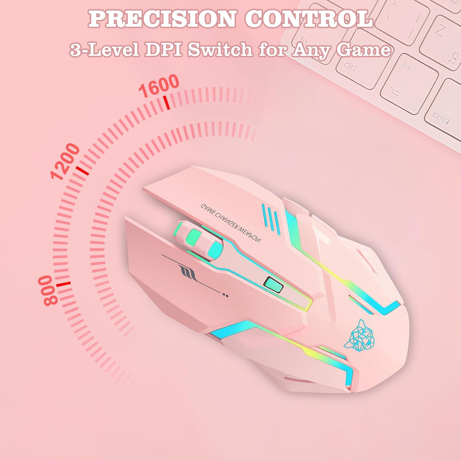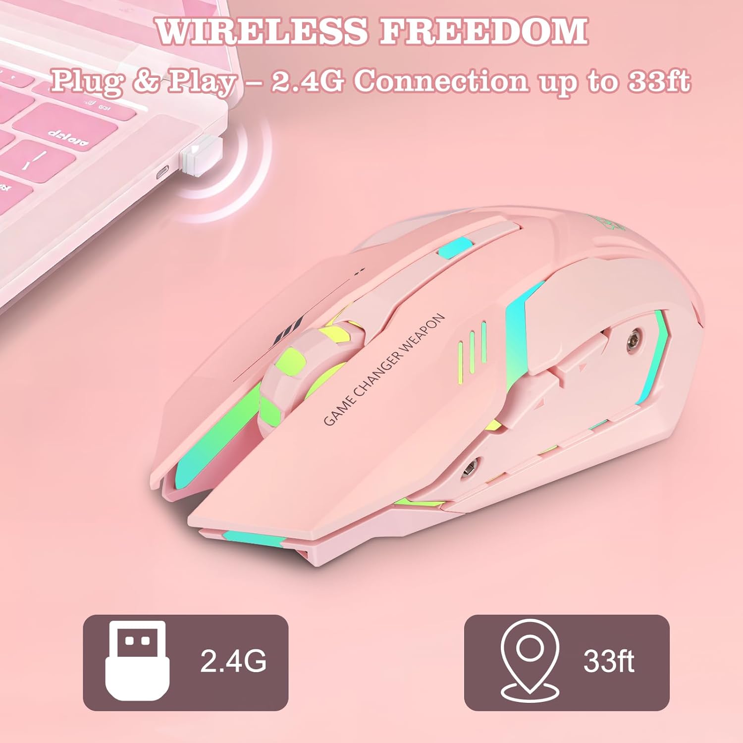 Wireless Gaming Mouse, Rechargeable Wireless Computer Mouse with Type-C Fast Charging, Ergonomic Mouse with 3 Adjustable DPI, 6 Silent Buttons, LED Light, Long Battery Life for Laptop, PC, Mac (Pink)