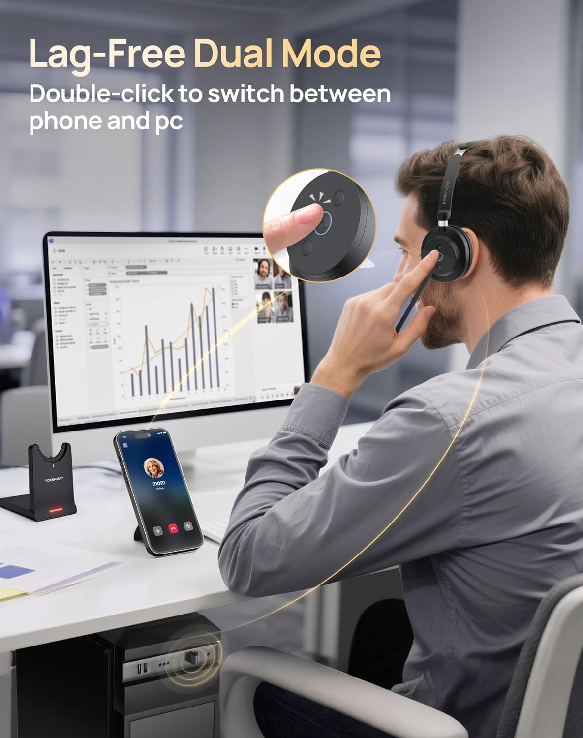 Long Battery Life & Dedicated Charging Base: With a powerful battery, this headset with microphone for pc provides up to 30 hours of continuous use on a single charge, and up to 500 hours of standby time, making it perfect for long conference calls and multitasking. The included charging base extends playback time for days, allowing you to enjoy music and calls without interruption. The base also features a USB storage slot, preventing the loss of the dongle and making your life more convenient.